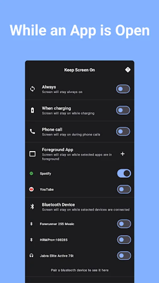 4. Keep your Screen On when an App is in the Foreground (PRO only).