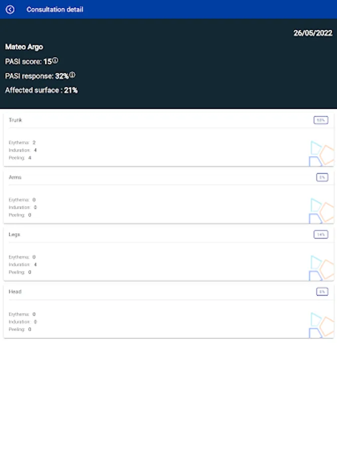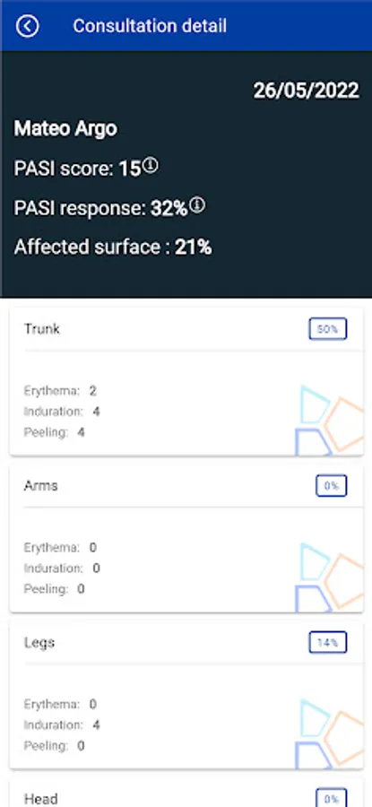a) Carry out the PASI calculation automatically with only 6 photos of the patient, taking advantage of the simplicity and speed provided by the artificial intelligence algorithms on which the app is based. In turn, at the end, send the professional by mail a detailed PASI calculation form