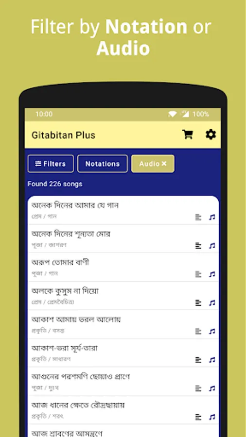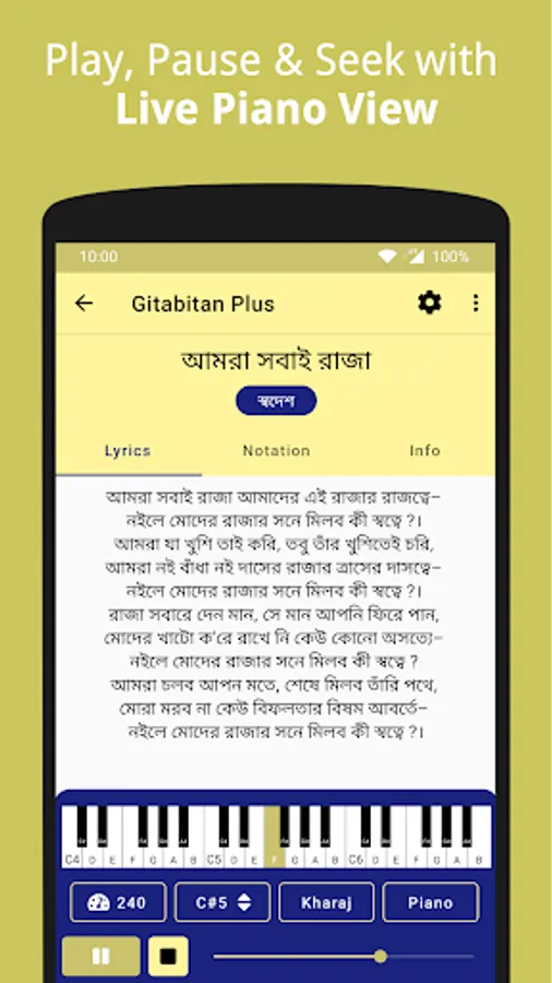 Gitabitan Plus is a complete Rabindra Sangeet app with lyrics, notations (swaralipi) and audio. The most important feature of Gitabitan Plus is the ability to playback the notations on the desired scale and tempo. The Live Piano View shows the current note being played, right on your mobile screen.