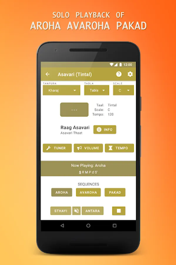The beat counter helps to sing or practice with ease. The vibration with every beat adds an added layer of sense while singing. You can see few informations about the raag being played like the thaat, aroha, avaroha, vadi, samvadi, sthayi and antara. Tabla bols are shown with every beat that helps new learners and tabla enthusiasts.