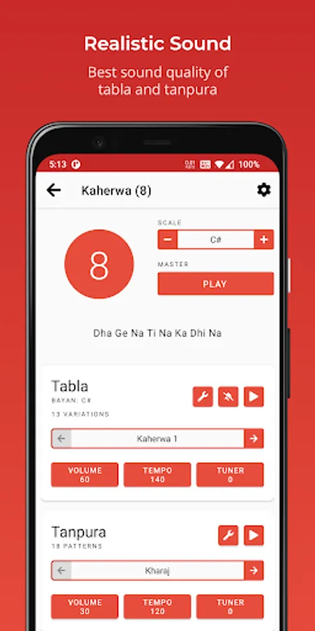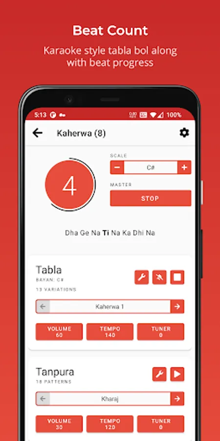 - Choose between North Indian (5 beat) or Carnatic Style (6 beat).