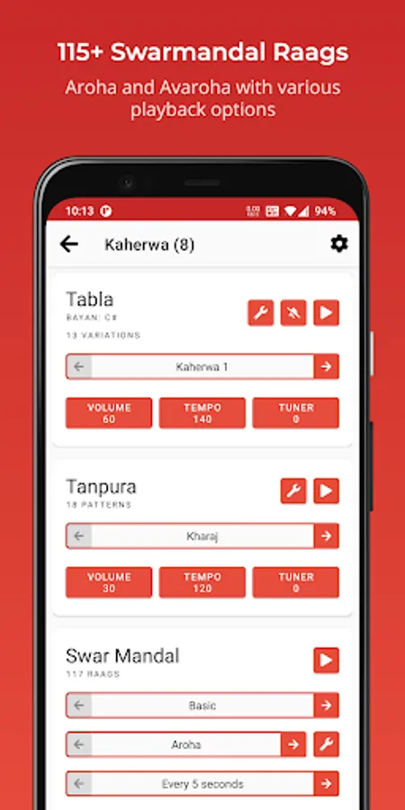 * 18 tanpura patterns (North Indian & Carnatic style).