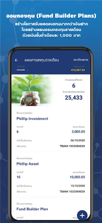• Fund Builder Plan: สร้างโอกาสรับผลตอบแทนมากกว่าเงินฝาก โดยสร้างแผนออมกองทุนรายเดือน ด้วยเงินขั้นต่ำเดือนละ 1,000 บาทต่อแผน