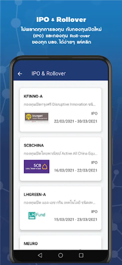 • IPO & Rollover: ไม่พลาดทุกการลงทุน กับกองทุนเปิดใหม่ (IPO) และ กองทุน Roll-over ของทุกบลจ. ลงทุนได้ง่ายๆแค่คลิก