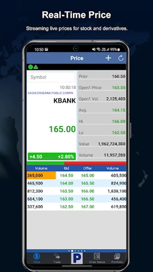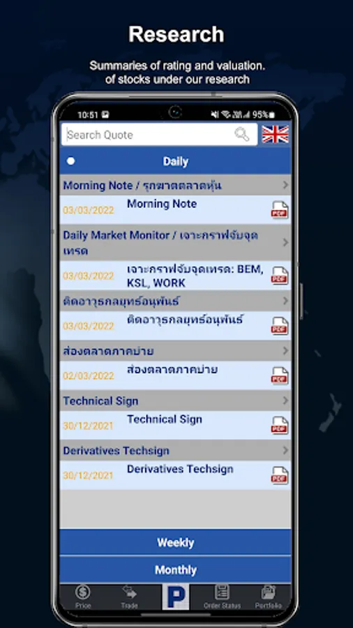 •ตรวจสอบราคาหุ้น ราคาอนุพันธ์ และราคาสินค้าอ้างอิงของสัญญาอนุพันธ์ (Underlying Assets) เช่น ราคาทองคำปัจจุบัน (Spot Gold Price) แบบ Real-time