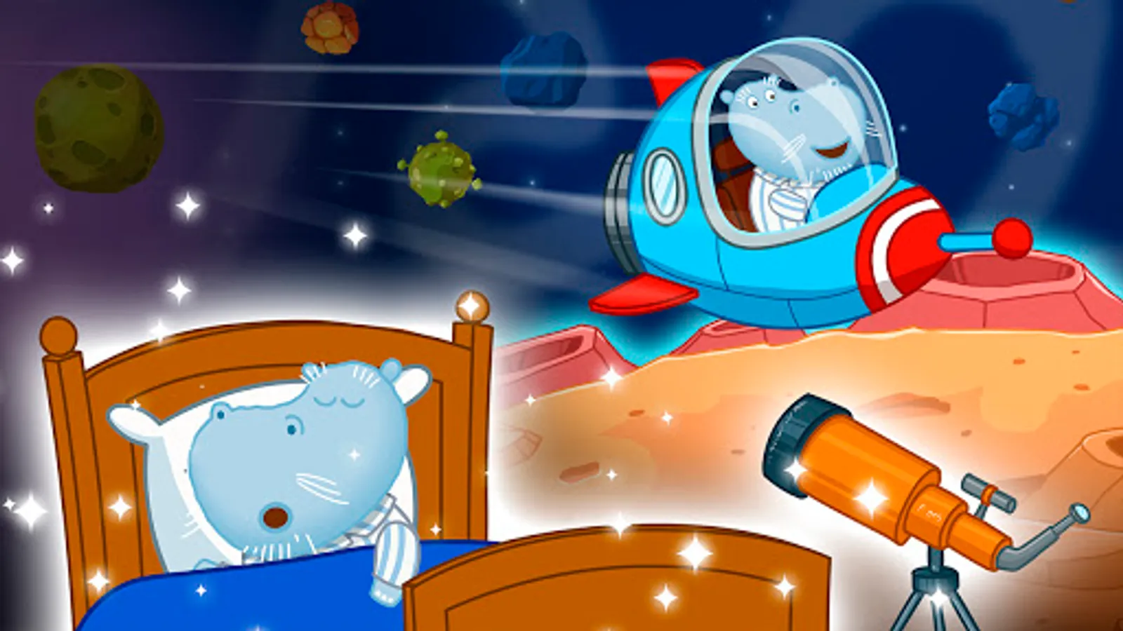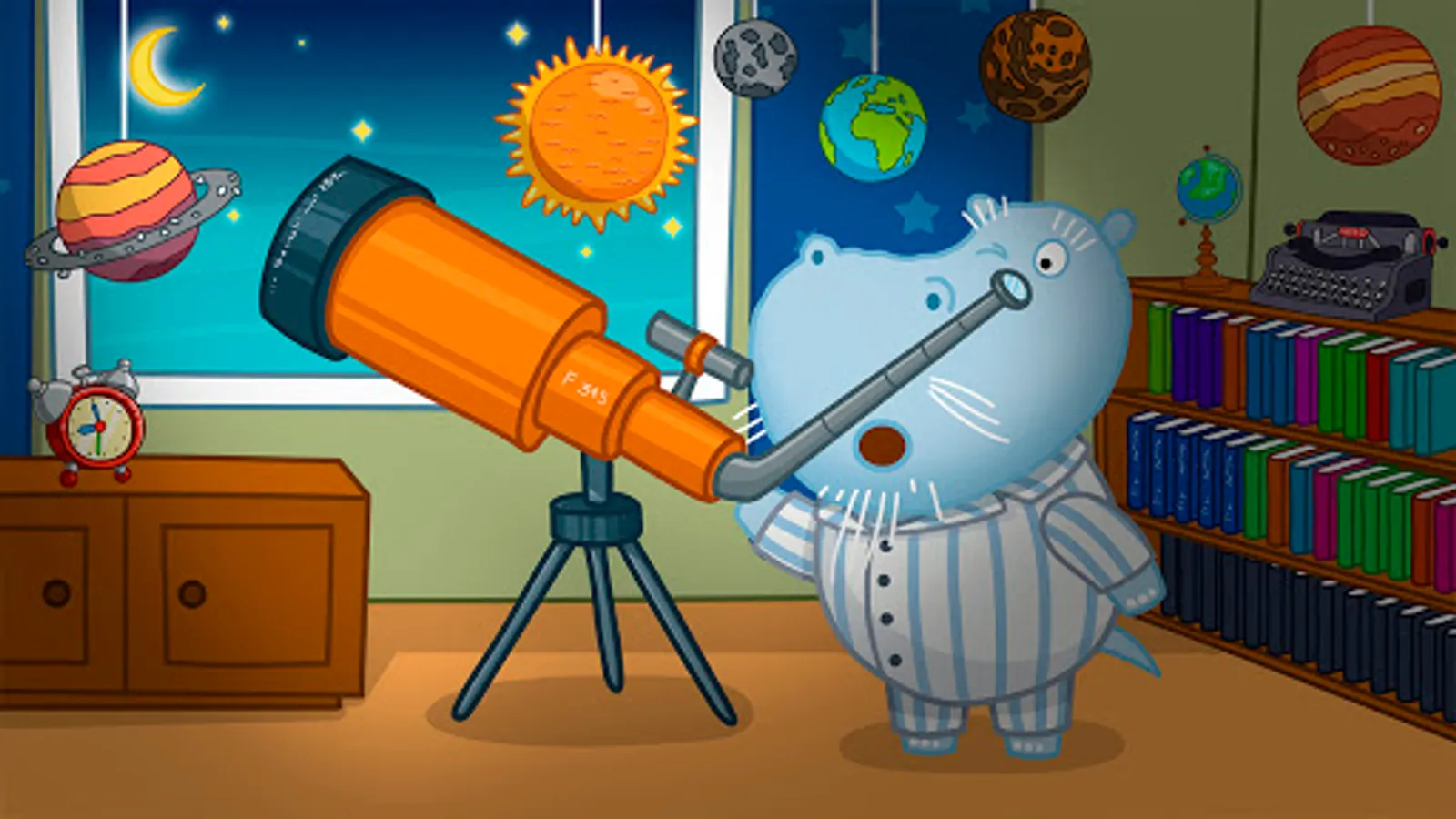 In a kids game series Bedtime Stories for boys and girls, player needs to do some simple actions to put a funny character to bed. This time we will play not only with one character, but the whole Hippo family and mysterious inhabitants of the pirate ship "Red Snapper". Everyone does something special before going to bed. One needs to tidy up the room before going to bed, and other has to finish the work. Papa Leo, for example, likes to write exciting stories before going to bed. And our grandfather is a famous developer! He looks through his telescope at the night sky and opens new unknown stars. You need to help all our characters. And, of course, our Lullaby includes educational elements. All our apps are, first of all, educational kids games.