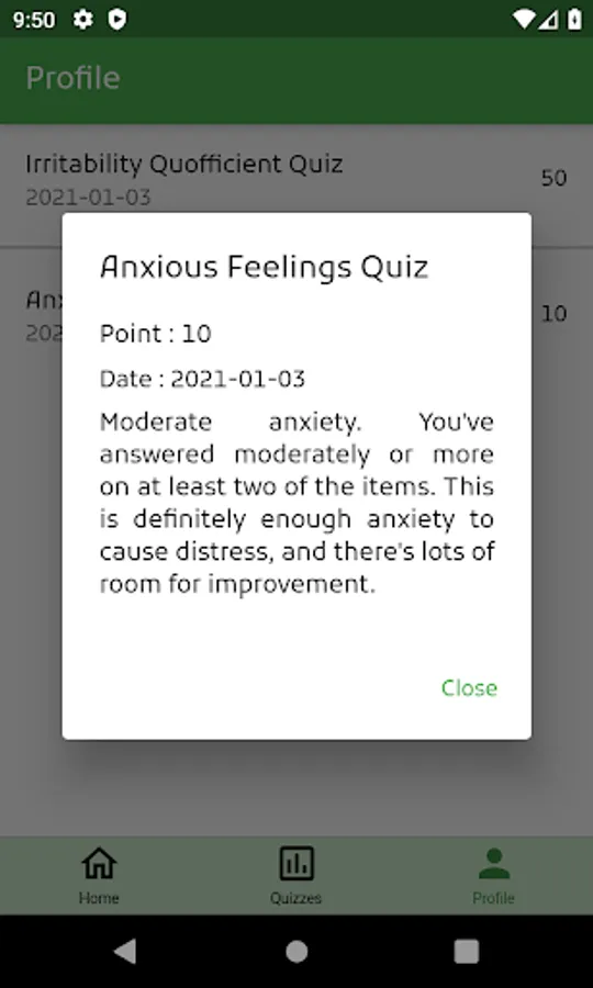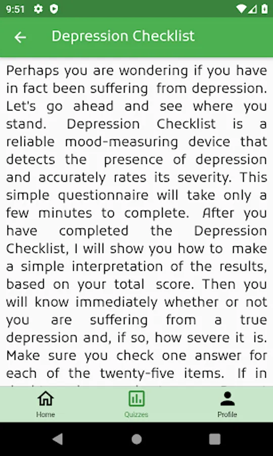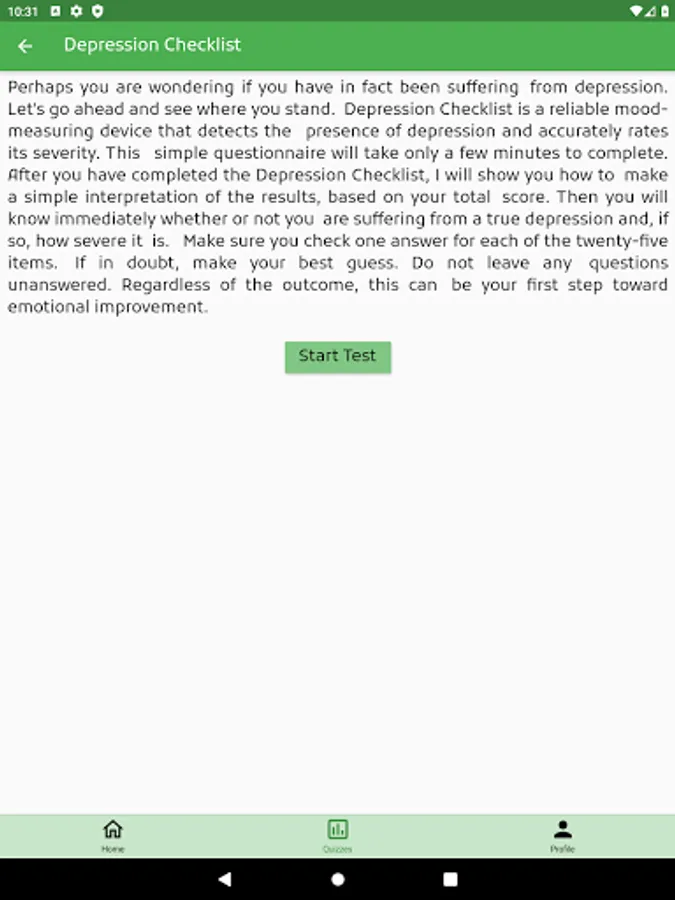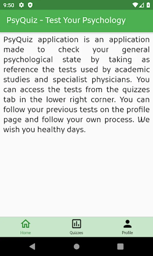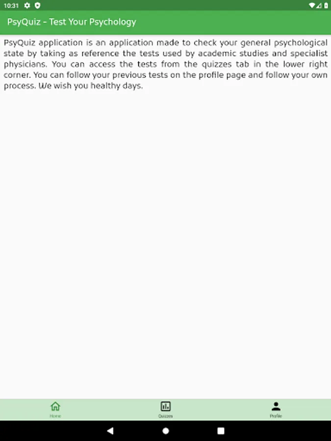 PsyQuiz application is an application made to check your general psychological state by taking as reference the tests used by academic studies and specialist physicians. You can access the tests from the quizzes tab in the lower right corner. You can follow your previous tests on the profile page and follow your own process.