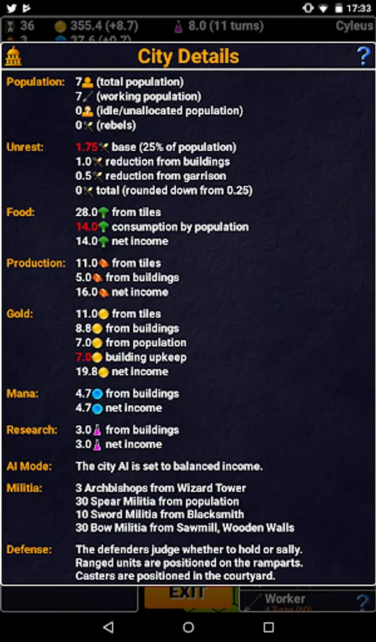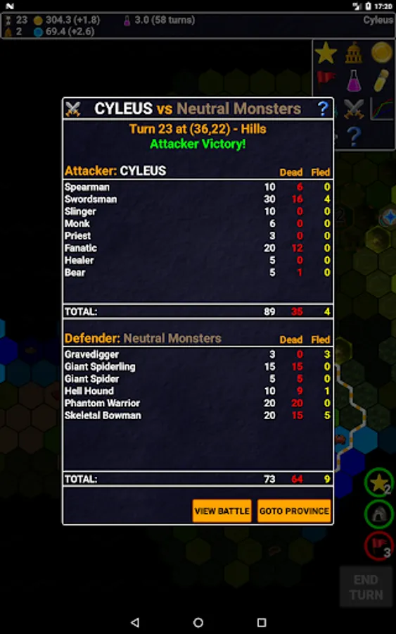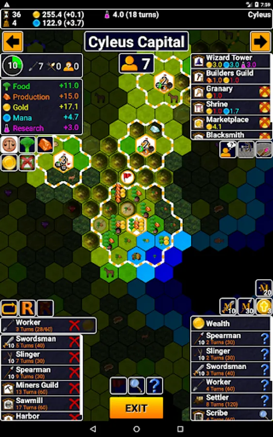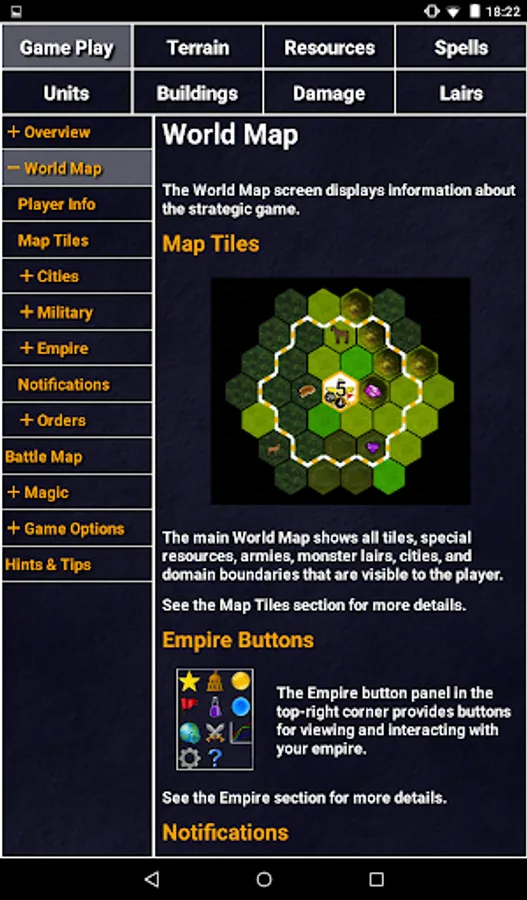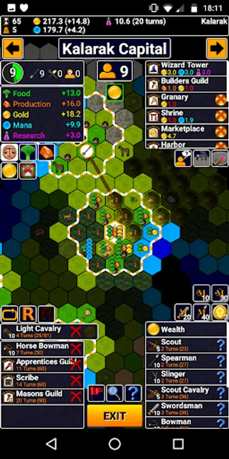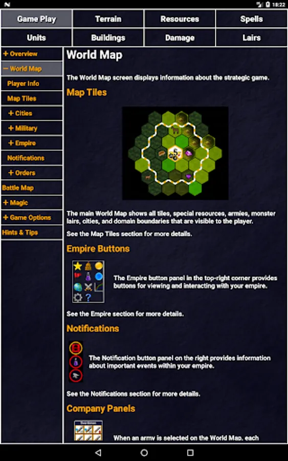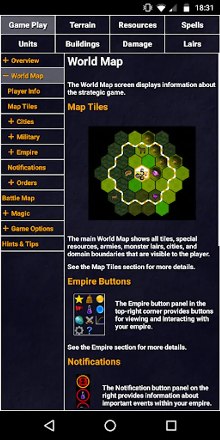 Wizard Warfare consists of a strategic level (the World Map) and a tactical level (the Battle Map). Exploration, expansion, production, research and city management all happen on the World Map, while battles are simulated on the Battle Map.