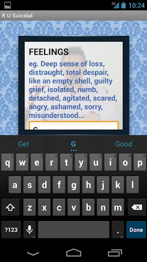 R U Suicidal? is a free app designed to help someone who may be or is suicidal. It is predominantly a video of a Psychologist speaking directly to the user and aims to be warm, supportive and encouraging. There are interactive phases where you can read some ideas or tips for feeling better and enter your own information privately into the smartphone. What you enter is not backed up to a website - it is just on the phone.