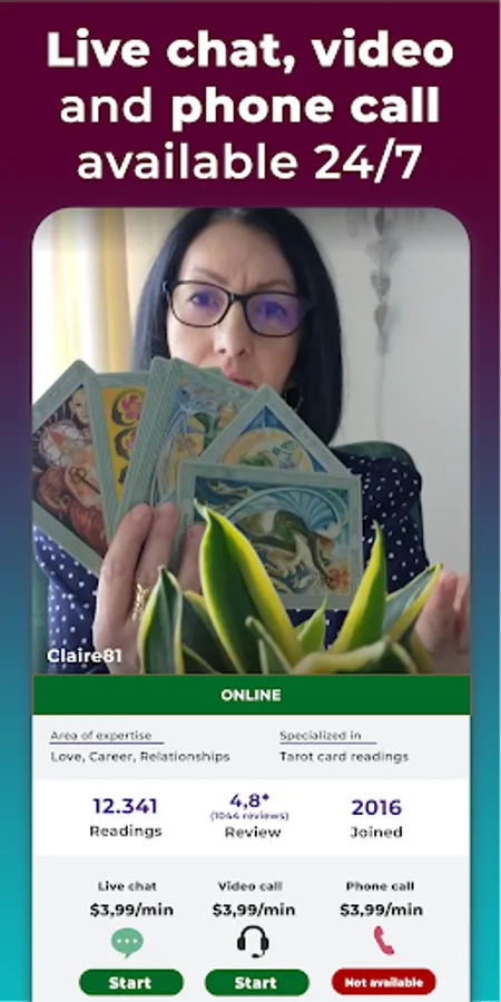 Claim your personalized psychic reading from top-rated experts now! By using our fortune teller app you will get first 3 minutes for free - offer applies for chat and phone conversations. We guarantee lots of advices about your future, based on experiences and knowledge. Moreover, personal approach is our main quality!