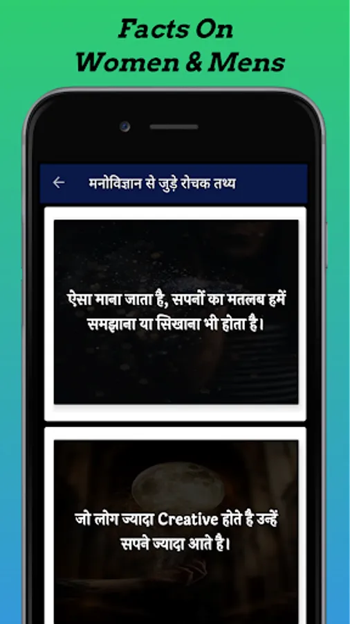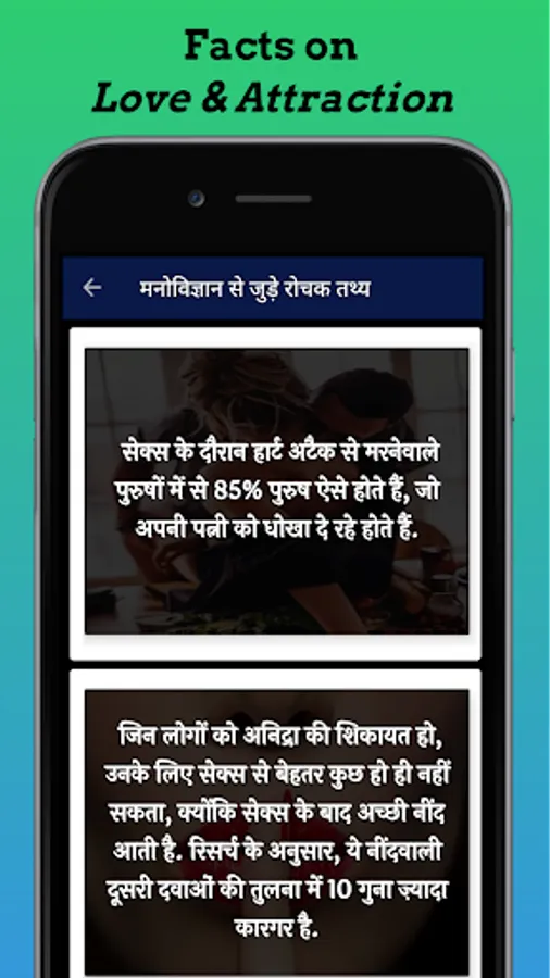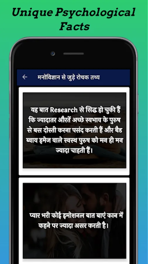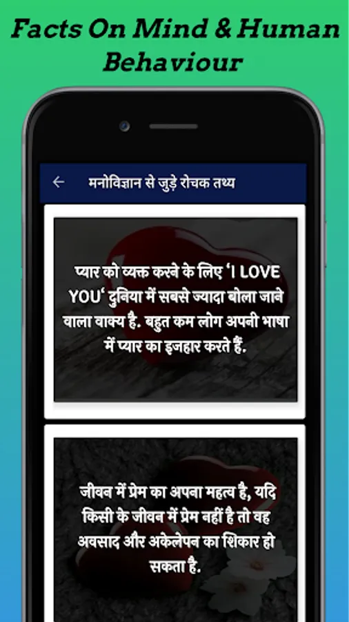 🏅Human Psychological Facts App (Manovaigyanik Tathya) OR Psychology Facts in Hindi is the Hindi Facts App contains 1000+ Amazing Psychological Facts about Human behaviour, Psychological Facts about Love, Psychological Facts about Girls & Psychological Facts about Boys ,Psychological Facts about Human Attraction and Affection &Psychological Facts about Body language, Psychological Facts about Personality ,Psychology Facts about women, Psychology Facts about men.