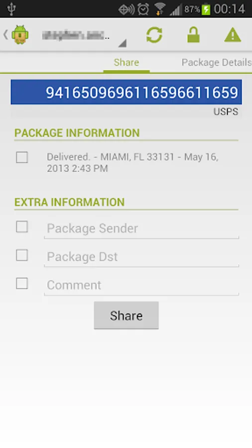 Send package information to others easily with the share screen. You can click on some carrier links to automatically fill out package information into Package Buddy.