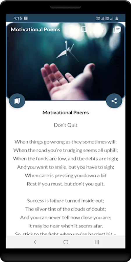 This app contains the best poetry and quotes collection to motivate a person in difficult circumstances. The content of the app is in English. This app will make you happy about its quality.