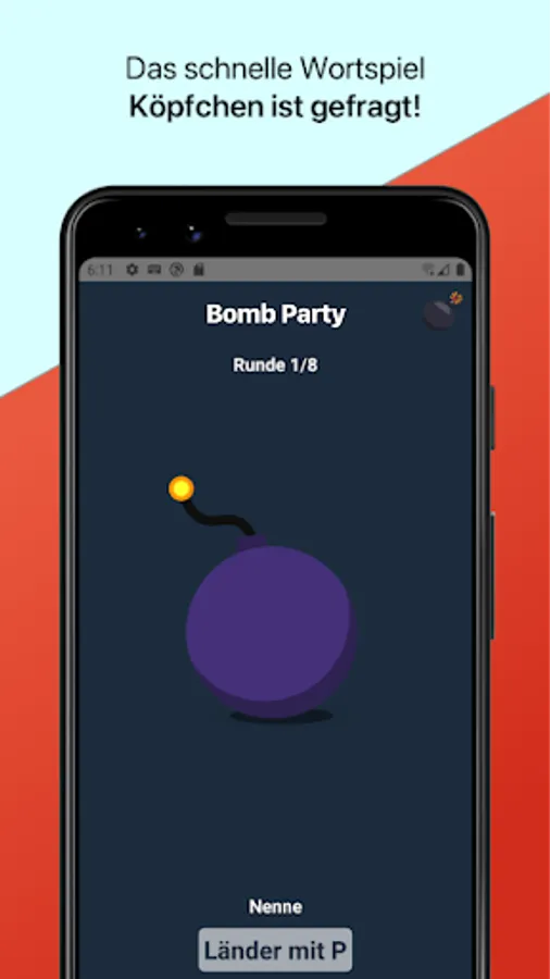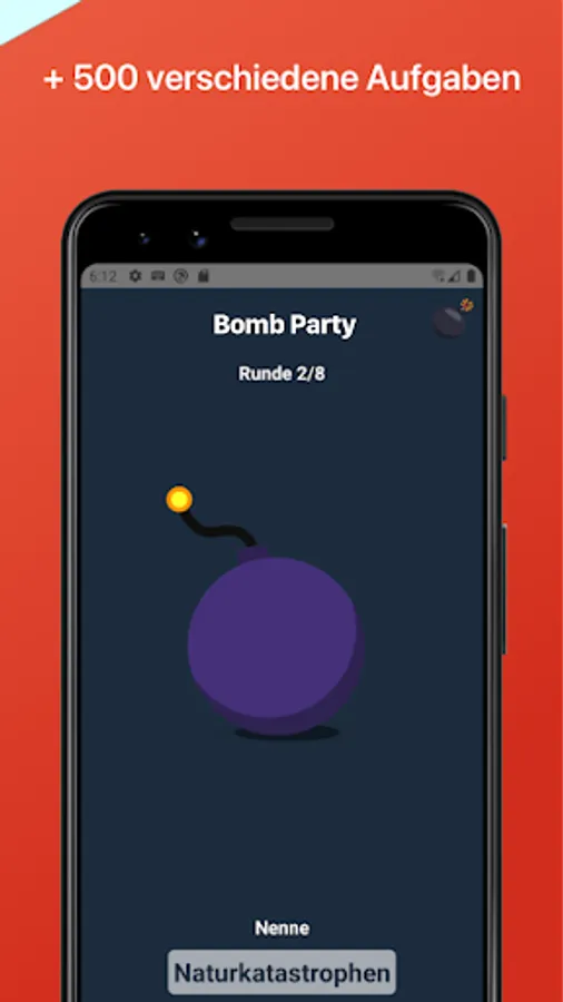 bomb party The pun on thrill. Each game consists of several exciting rounds. The goal is to find new words for certain categories while passing the bomb (smartphone) around in a clockwise direction. One of your unlucky players will have the bomb explode and you've lost that round. Whoever has the fewest explosions at the end wins the game. Watch out! The time to detonation varies with each round for an even greater thrill.