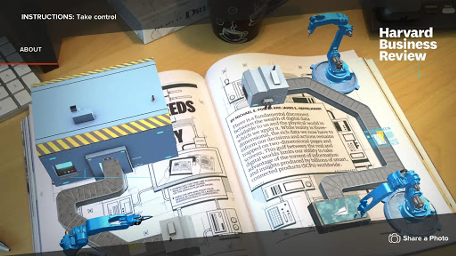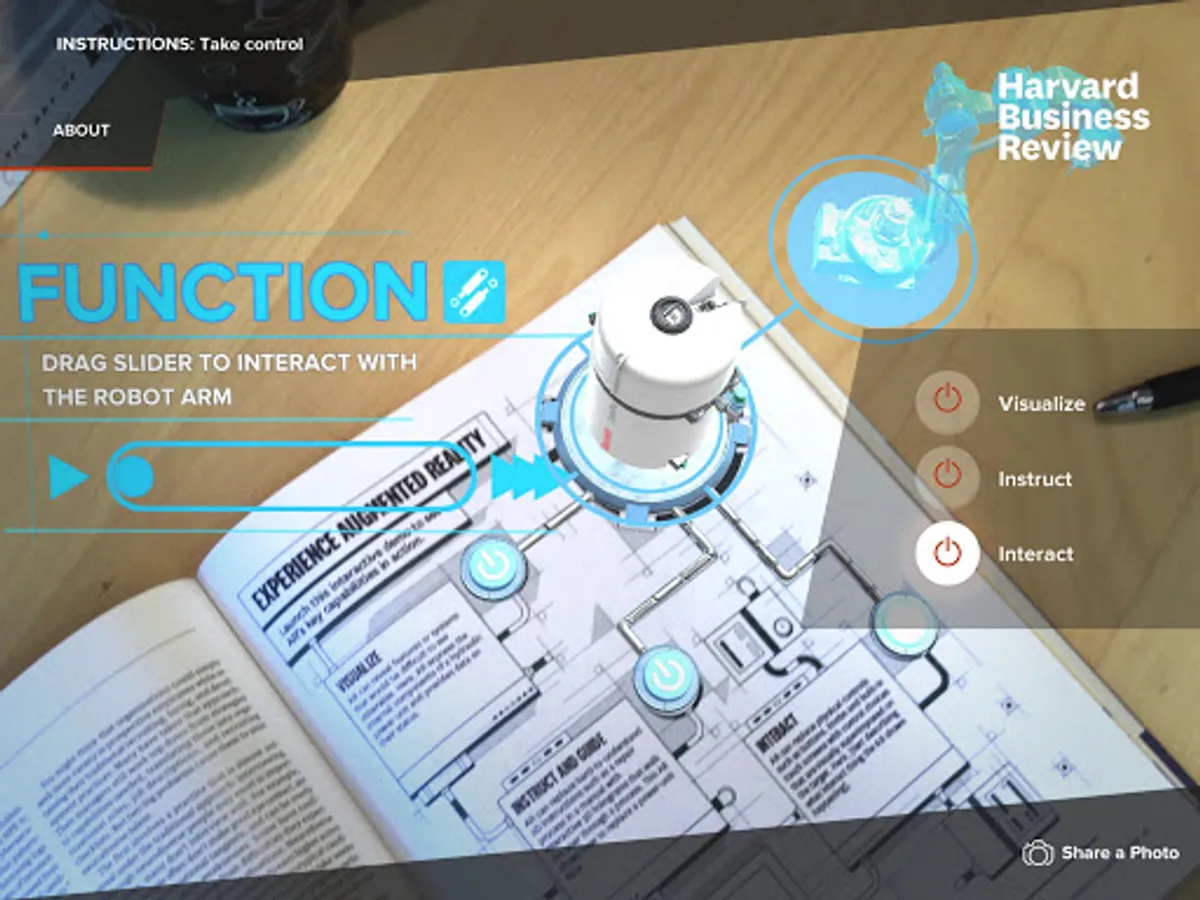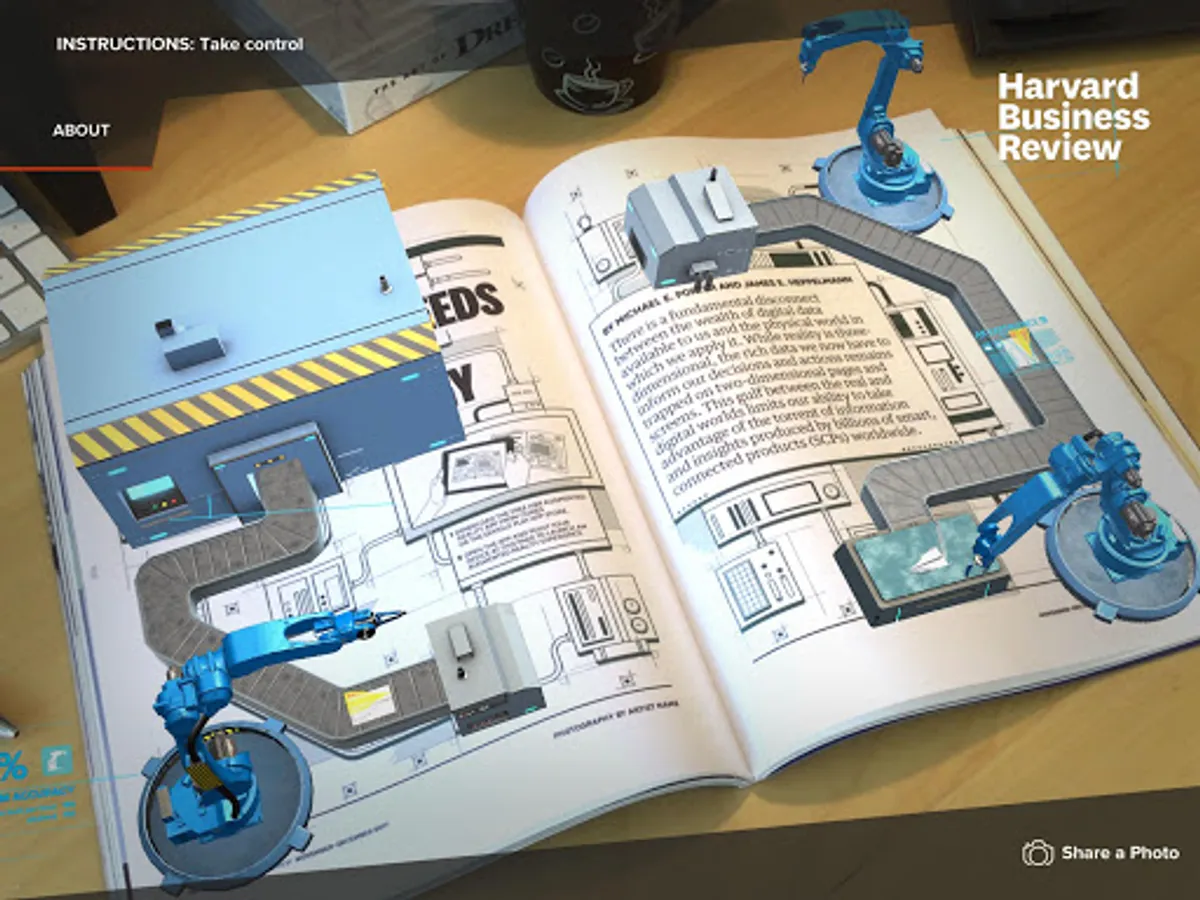 Experience augmented reality as you explore the November-December 2017 HBR article “Why Every Organization Needs an Augmented Reality Strategy,” by Michael Porter and James Heppelmann. Simply open the magazine to the article’s AR-enabled illustrations, point your mobile device, and watch the graphics come to life. If you don’t have the magazine, you can download the article directly from the app. Move and tilt your device to see AR’s capabilities in action: Watch an animated X-ray view of a hydraulic power unit, see step-by-step instructions for a repair, and control a robot arm with your touchscreen.