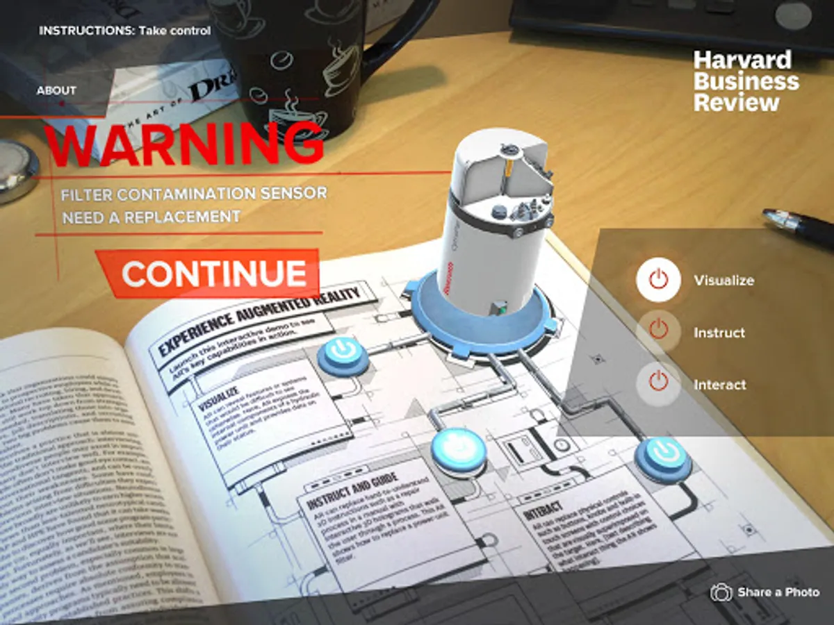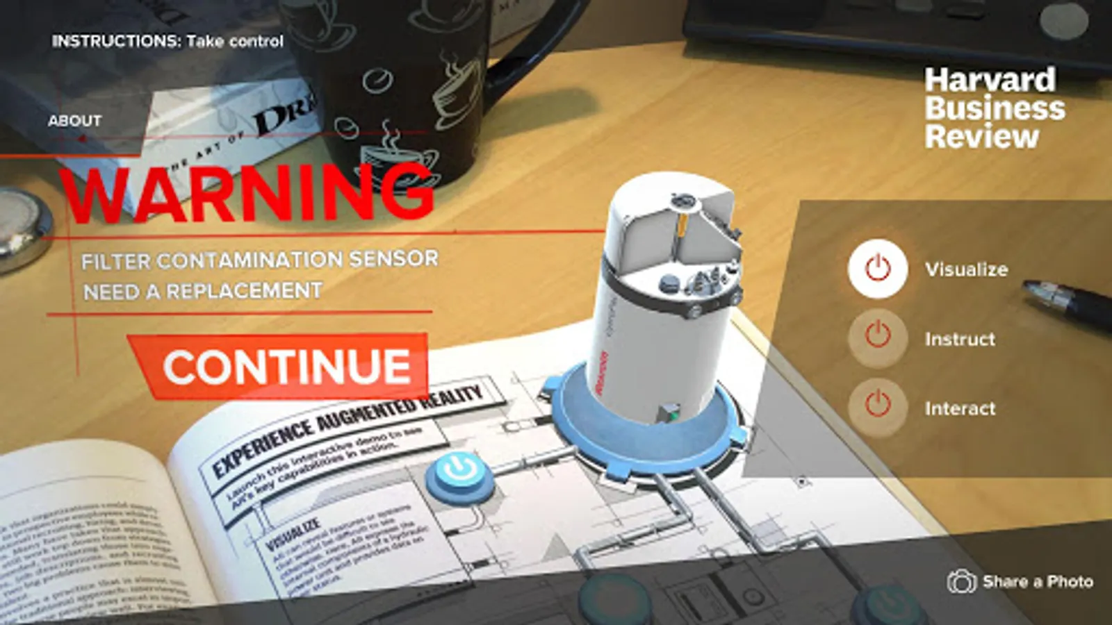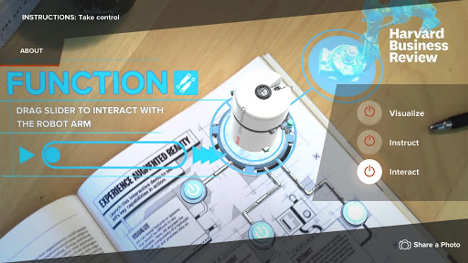 Experience augmented reality as you explore the November-December 2017 HBR article “Why Every Organization Needs an Augmented Reality Strategy,” by Michael Porter and James Heppelmann. Simply open the magazine to the article’s AR-enabled illustrations, point your mobile device, and watch the graphics come to life. If you don’t have the magazine, you can download the article directly from the app. Move and tilt your device to see AR’s capabilities in action: Watch an animated X-ray view of a hydraulic power unit, see step-by-step instructions for a repair, and control a robot arm with your touchscreen.