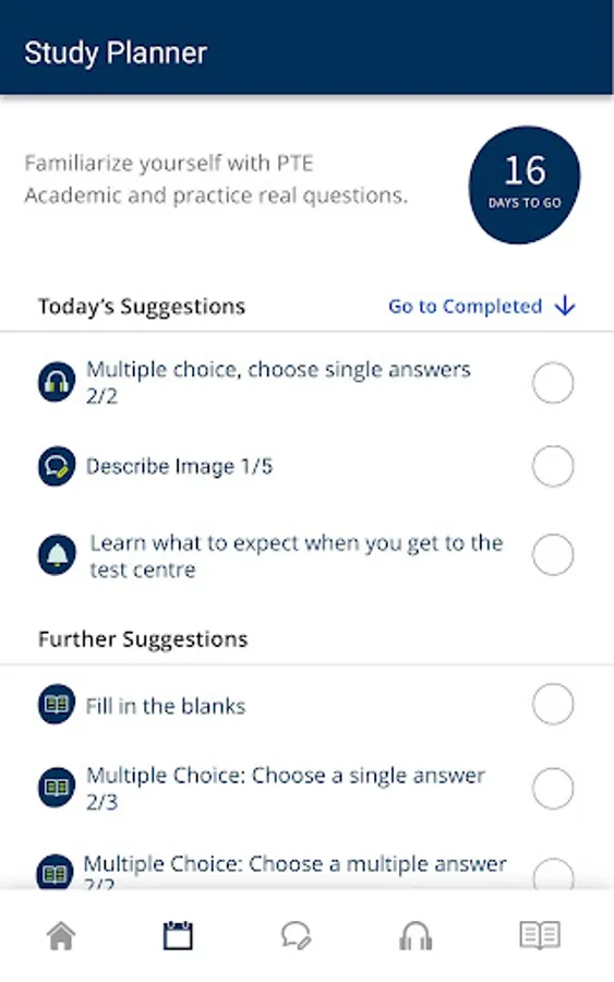 Be ready in time for your test using our handy study planner. With daily suggestions for activities to practice and a countdown until the exam, you can organize your time effectively and make sure you’ve covered all the bases. Simply work through the suggested activities, ticking them off as you go.