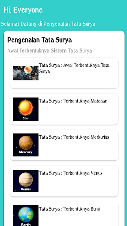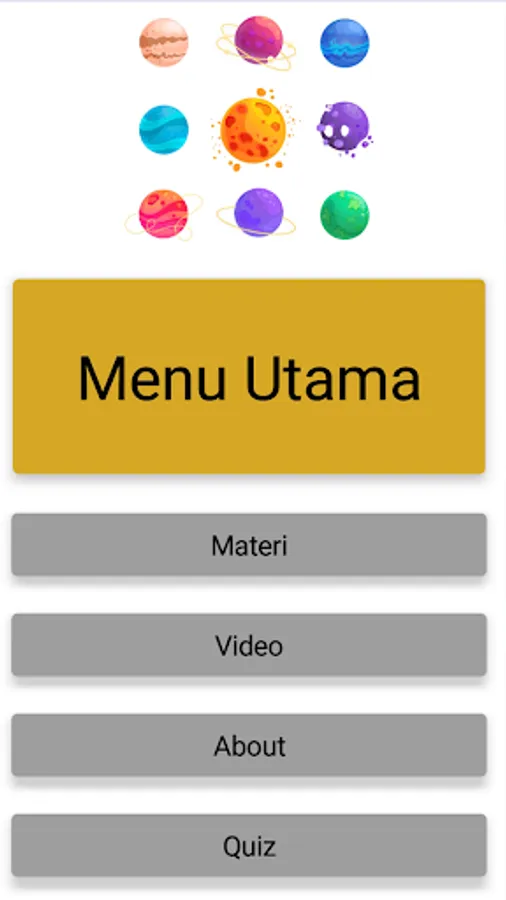 Aplikasi pembelajaran berbasis Android, yang berisi tentang materi sistem tata surya yang berisikan penjelasan seluruh sistem tata surya, dan video serta kuis pada aplikasi tersebut. Kami membuat aplikasi ini untuk memberikan kesan baru kepada user terhadap pembelajaran berbasis Andoid/Apk, agar user lebih bisa menikmati setiap bacaan yang baca. Sama seperti buku namun kami kemas lebih menarik saja. aplikasi ini dibuat juga agar user paham terhadap sistem tata surya yang kita tempati juga, sejarah terjadinya diciptakan planet-planet yang berada di sistem tata surya menurut teori ilmiah.