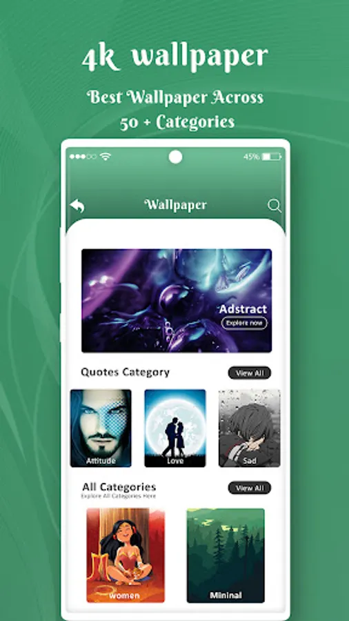 This 4k wallpaper for android app is a great tool for Full HD Backgrounds and Wallpaper Store for user where they can experience best handpicked and creative backgrounds to make your screen unique and elegant.
