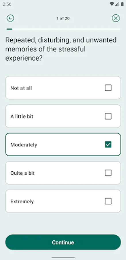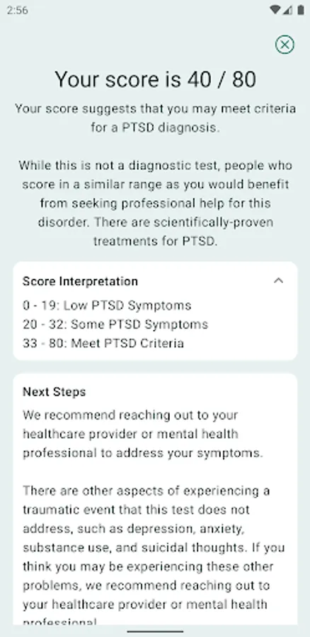 This app is designed to evaluate your symptoms of PTSD with a scientifically-supported 20-question screening test. It uses the PTSD Checklist for DSM-5 (PCL-5), a screening questionnaire for PTSD that is often used in healthcare and research settings. The PCL-5 is also helpful for monitoring your PTSD-related symptoms during and after treatment.