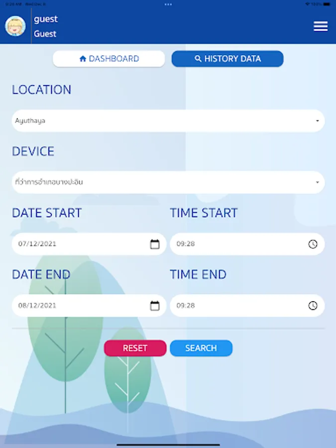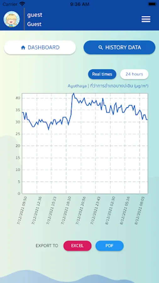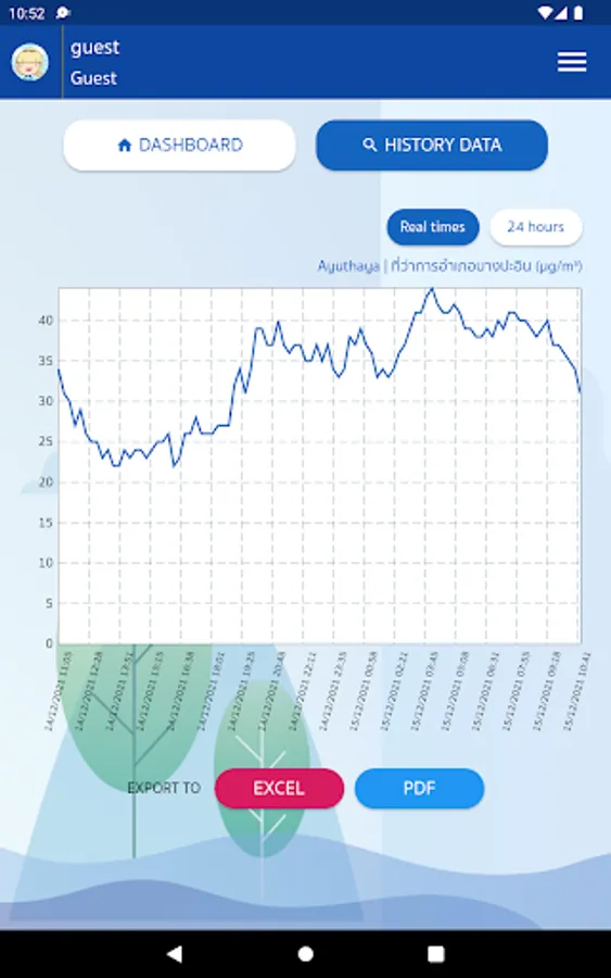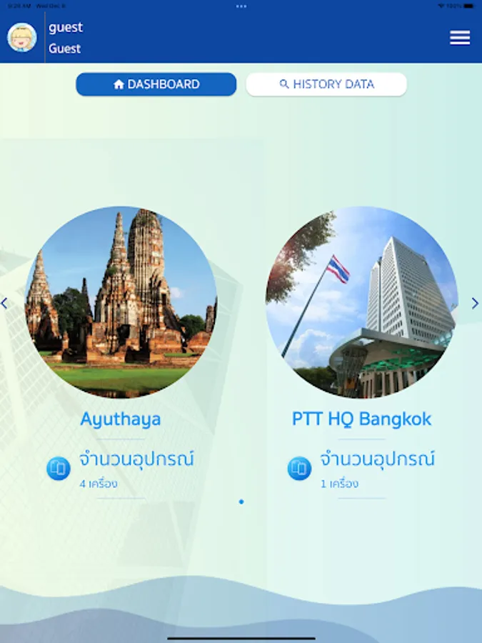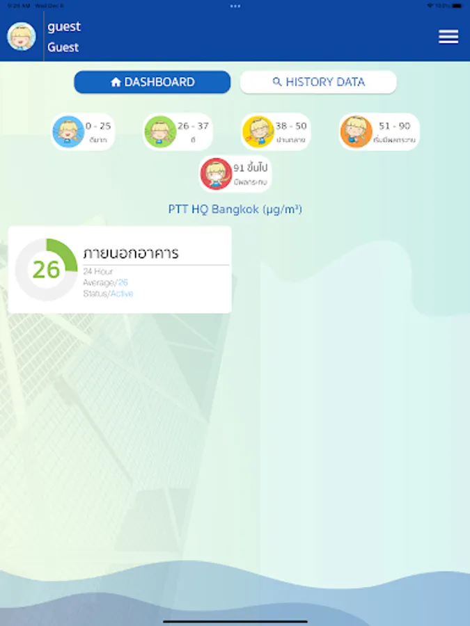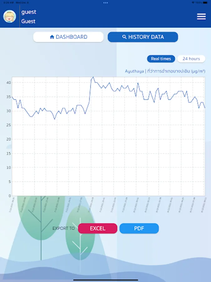 สามารถเรียกดูค่าผลตรวจวัดคุณภาพอากาศ (PM 2.5) ที่ติดตั้งเครื่องตรวจวัดไว้ตาม Location ต่างๆ แบบ Realtime และ ย้อนหลังได้ โดยจะแสดงผลในรูปแบบกราฟและตัวเลข รวมถึงสามารถ Export ข้อมูลรายงานผลตรวจวัดคุณภาพอากาศในรูปแบบ Excel file & PDF file ได้