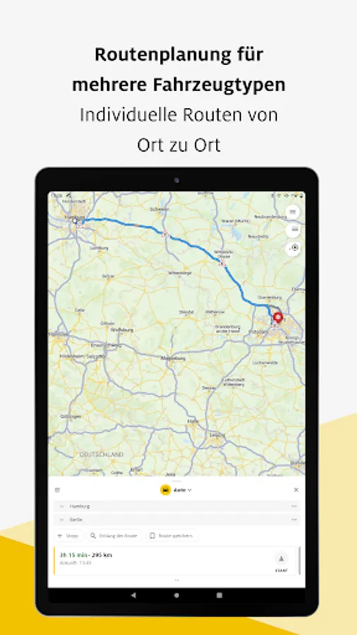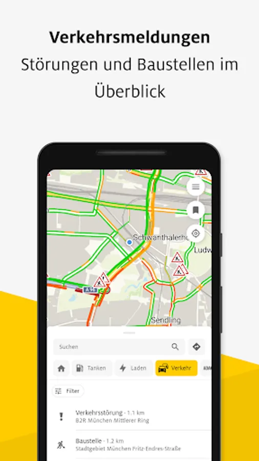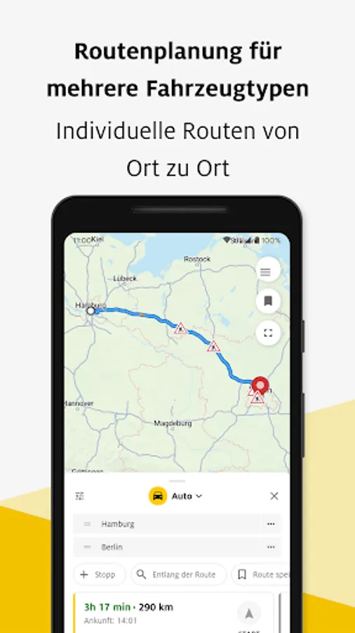 And with the route planner for different vehicle types, the full navigation and real-time reports on the current traffic situation, the app guides you safely through your mobile everyday life and all holiday activities.
