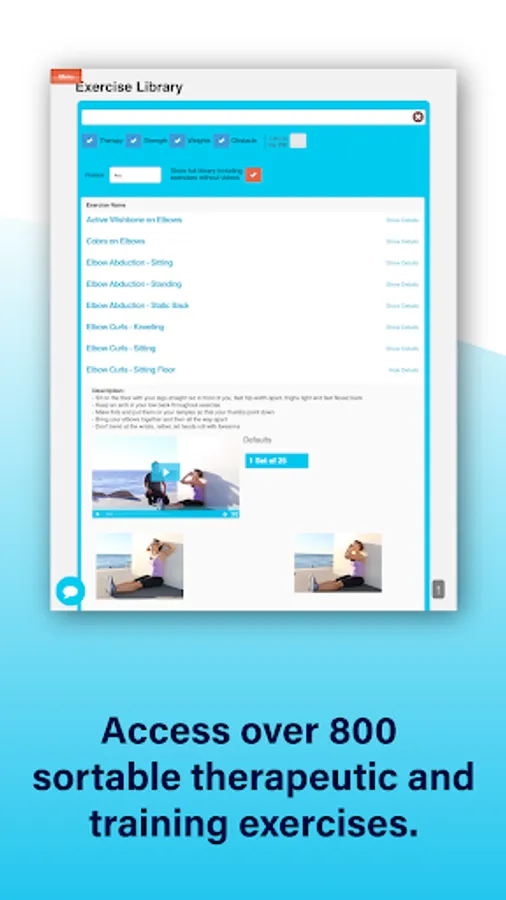 1. Sequencing from database of over 600 therapeutic and resistance training exercises; tailor make each routine for your clients.