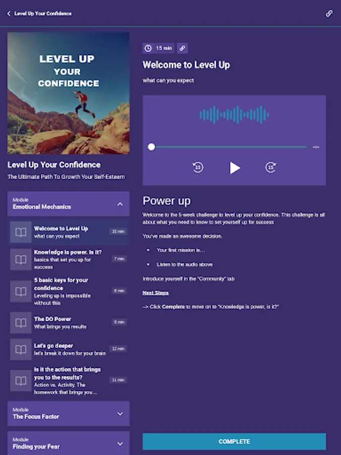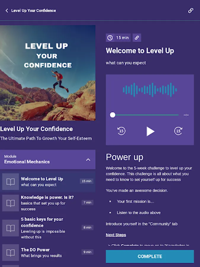 This app brings you to the next level in your confidence and self-esteem. Join our community & check out the unique content that will help you go further faster higher in your life. Installing the app is free of charge.