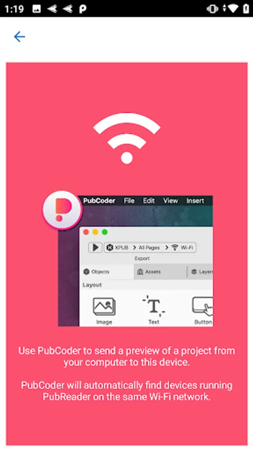 - Live Preview PubCoder projects: send your work to any smartphone or tablet using PubReader on the same Wi-Fi network with a click