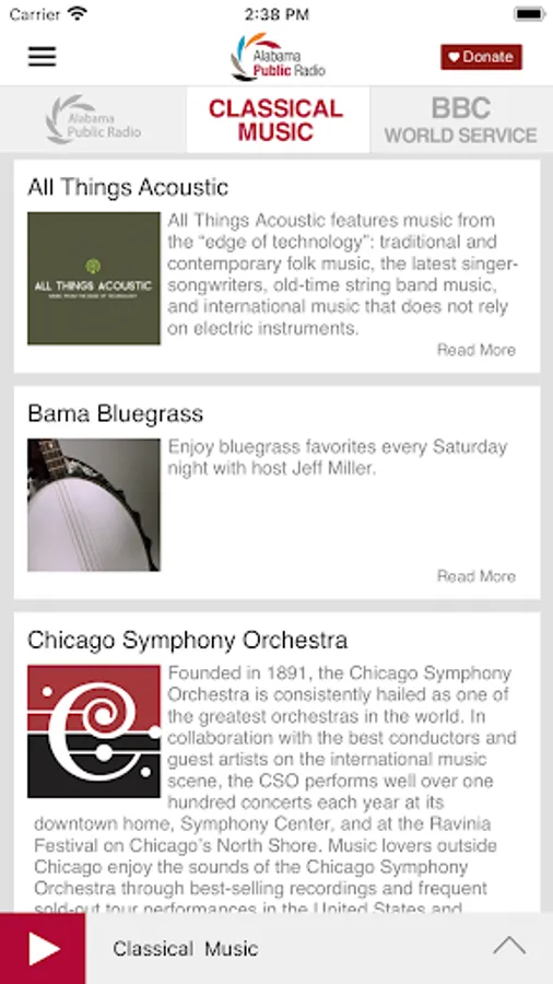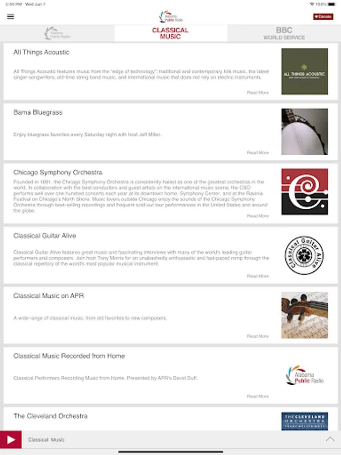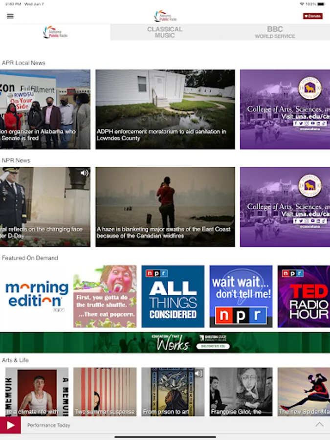 The Alabama Public Radio App allows you to listen to WUAL-FM, pause and rewind the live audio, view the program schedule, and wake up to APR with the alarm clock!