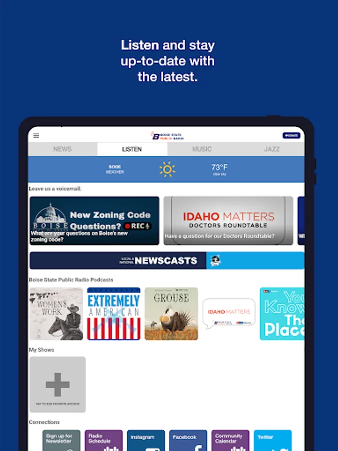 The Boise State Public Radio App is brought to you by the people at Boise State Public Radio and Public Media Apps. We work to provide our valued listeners with great solutions to find what you want, when you want it, and where you want it.