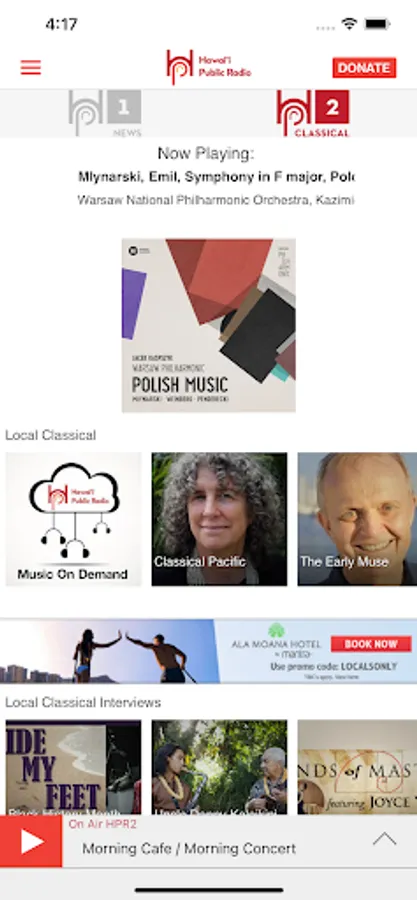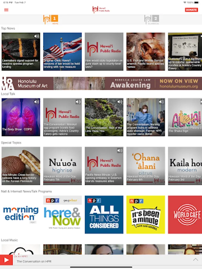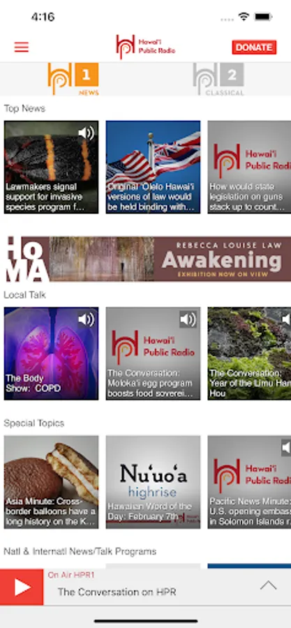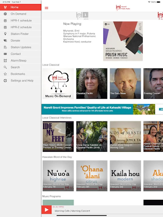 The Hawaii Public Radio App allows you to listen to HPR live, pause and rewind the live audio, and view the program schedule all at once! You can explore On Demand content, search for stories, bookmark a story for later, and wake up to HPR with the alarm clock!