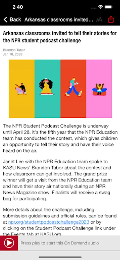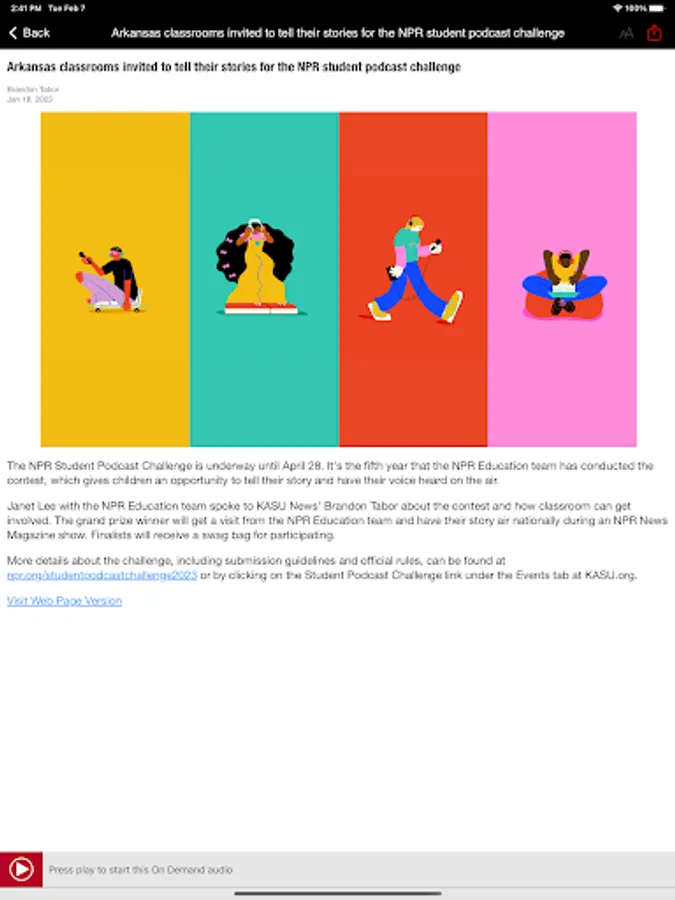 • The KASU App displays the web page associated with the program or program segment you are listening to On Demand so you can explore for more information.