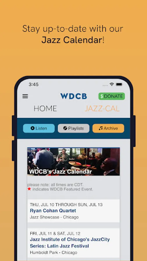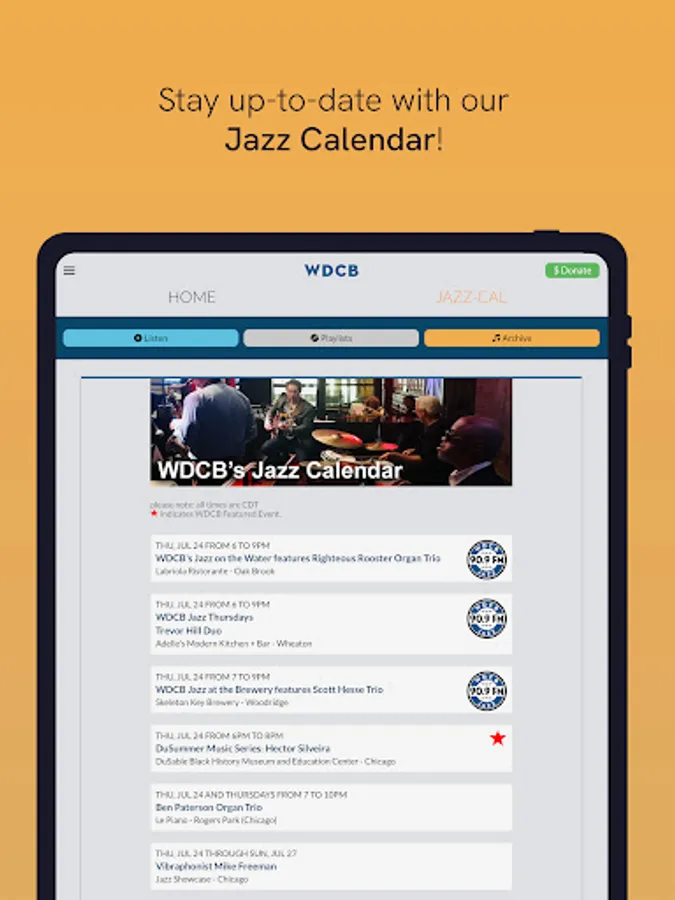 The WDCB App allows you to listen to the WDCB, 90.9FM livestream, stay up-to-date on jazz events in Chicagoland and view the WDCB radio program schedule.