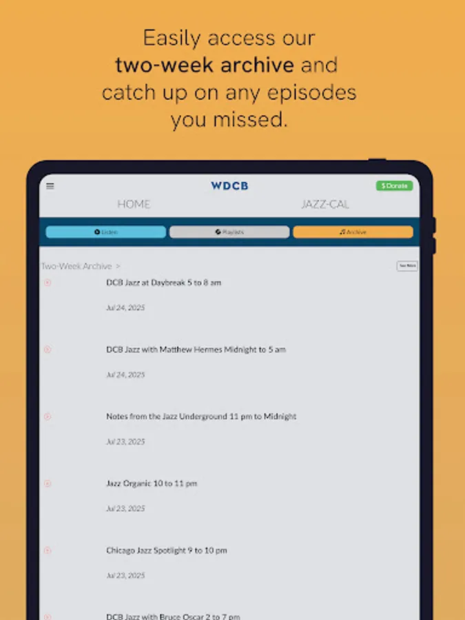 • Easy access to WDCB’s archives to catch up on any shows you missed.