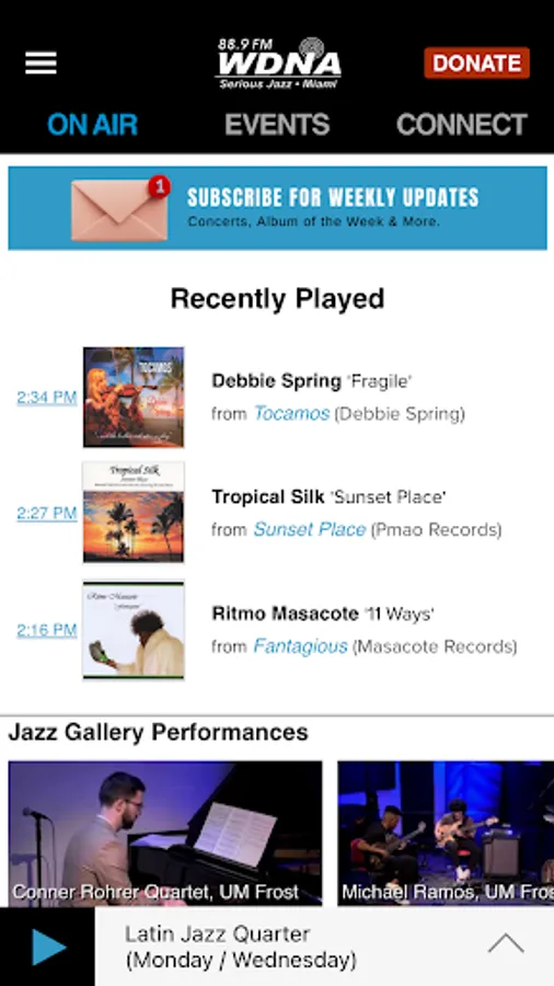 Watch the latest WDNA Jazz Gallery performances; Stay up to date with the album of the week, Read BBC news headlines; and Connect with WDNA via voice note, social media, phone or email.