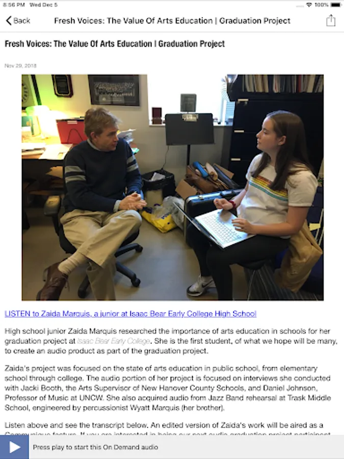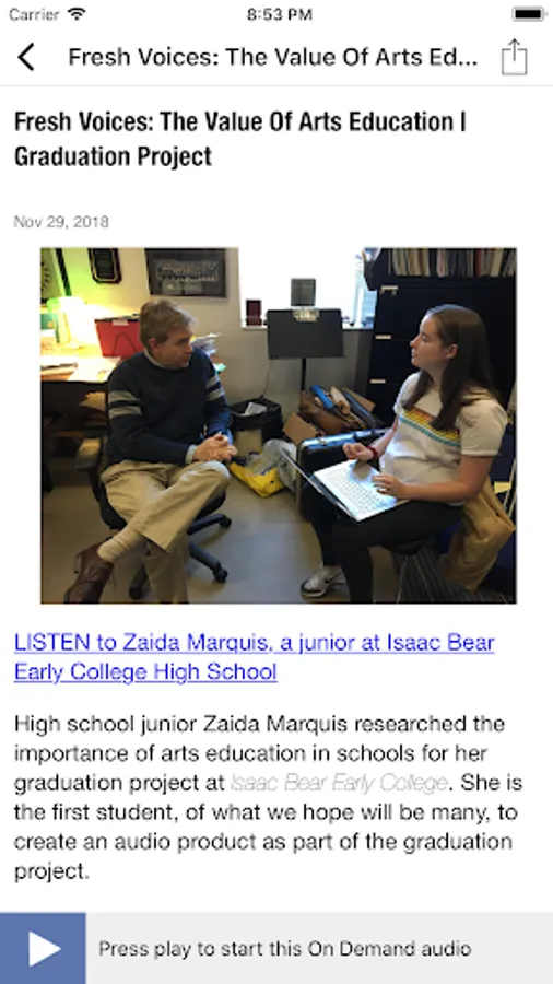 The WHQR Public Radio App displays the web page associated with the program or program segment you are listening to On Demand so you can explore for more information.