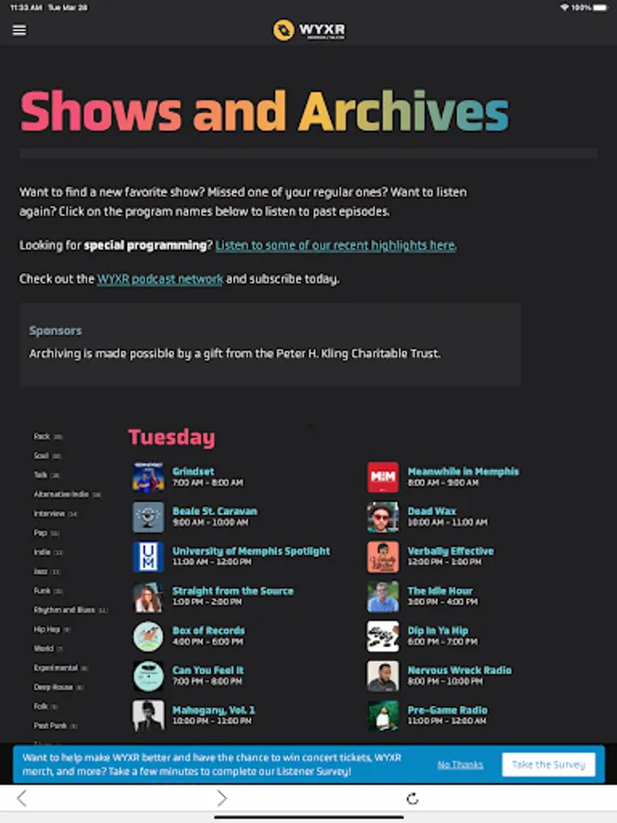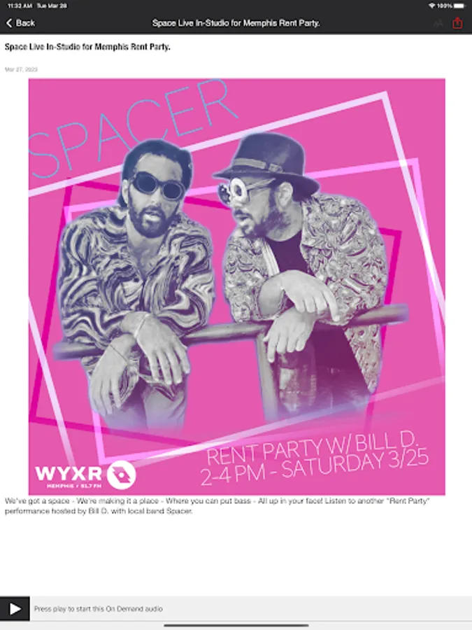 WYXR 91.7 FM is a non-profit, listener supported radio station in Memphis, TN, which connects Memphis and its surrounding area to the globe, celebrating the rich heritage of music in the region. Deeper than the King of Rock N’ Roll, Blues and the Tender Soul hitmakers of Memphis history, the station champions the discovery of music among our neighbors, highlighting independent, homegrown acts whose music may have missed the mark of widespread acclaim in its heyday, along with a hearty helping of soon-to-be local stars of the here and now. Our DJs, talk and news hosts are given the room to explore the endless bounds of various genres. Our format isn’t based on charts, stats and demographics. Our format is Memphis and the people, of all tastes, backgrounds, and interests, who make it a vibrant place to live, work, and build community together. Now, you can experience all of WYXR’s live programming from the convenience of a mobile app. Take your favorite shows on the go, from work, to the gym, in transit and at home. In our weekly programming schedule, you’ll hear original programming from volunteer hosts such as: - Andrew Van Wyngarden - DJ Spanish Fly - Joe Restivo - Robert Gordon - DJ KVNG - Elizabeth Cawein - Tonya Dyson - Jim Spake