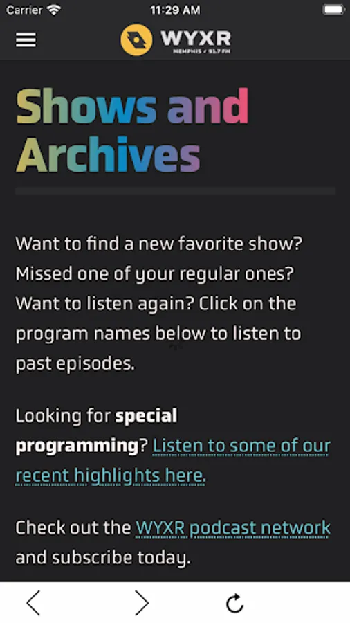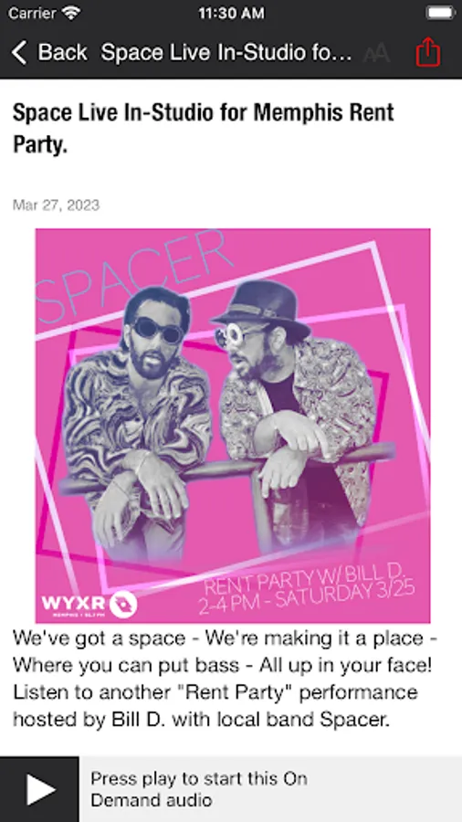 & more… Features include: - Real-time access to programming playlists: Tired of searching for the name of the song on the radio? Get instant information in-app about each song and artist played on WYXR. It’s just what you needed to follow your new favorite artists and albums. - Live announcements: Want to be the first to know when special guests, prize offerings, news and other exciting announcements hit the airwaves? Now you can be notified when something sensational is happening at WYXR. - Dig into our mission: Find out more about WYXR’s vision for building the morale of Memphis, using music as an ambassador to open its doors to the world.