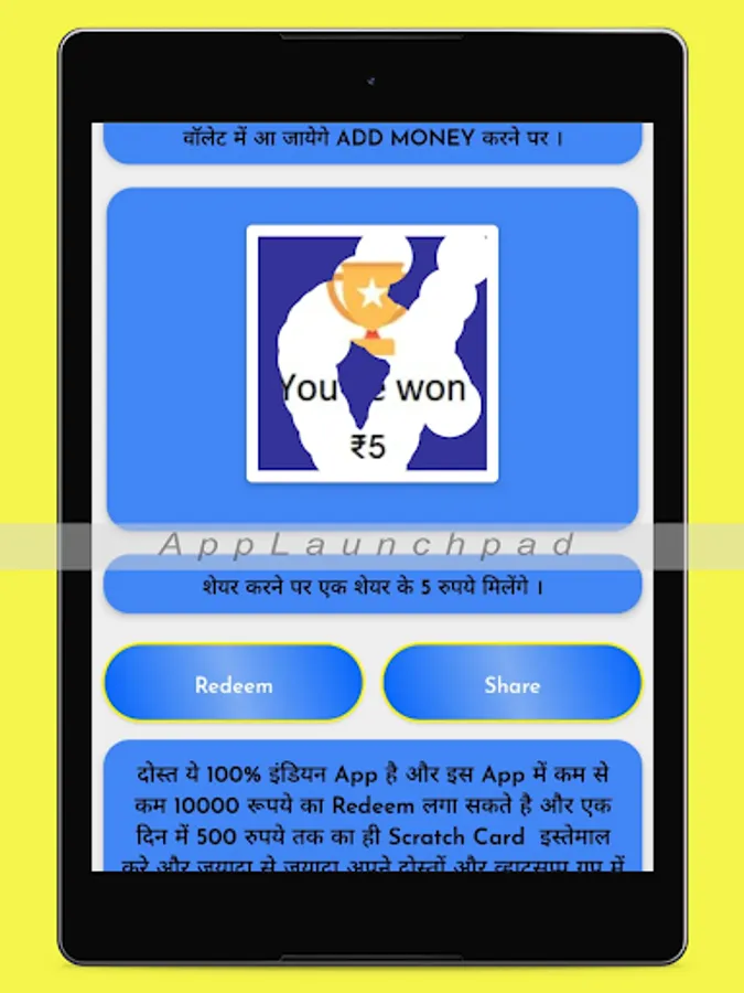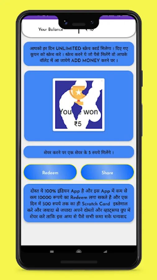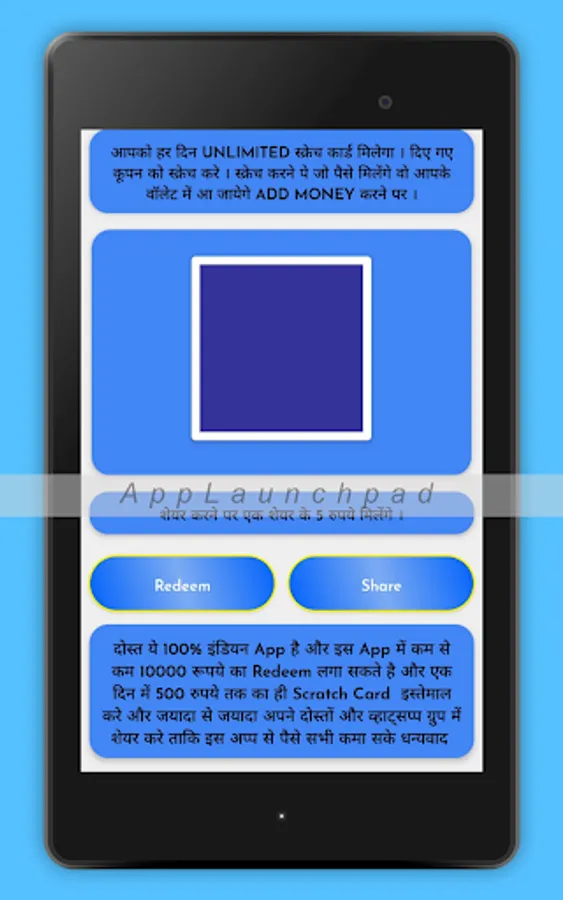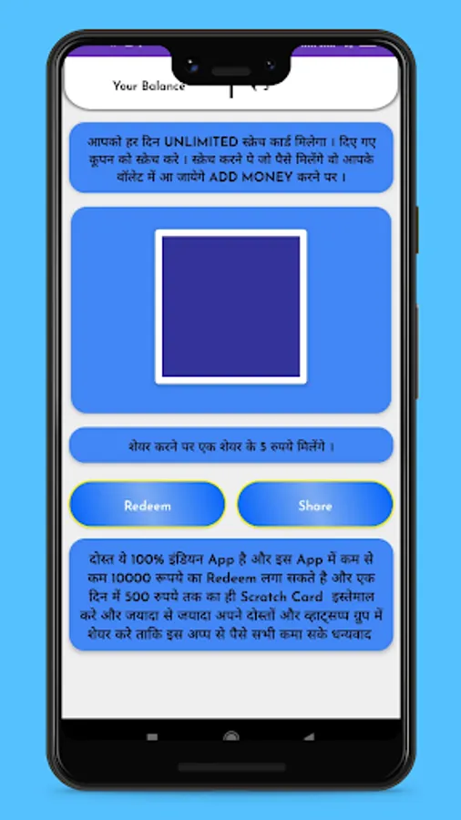 }-- User can get randomly rewards by scratch card. It's depend on your luck and chance to win some virtual coin. This app is designed for entertain purpose. we will hope user will entertain or engaged with this app.
