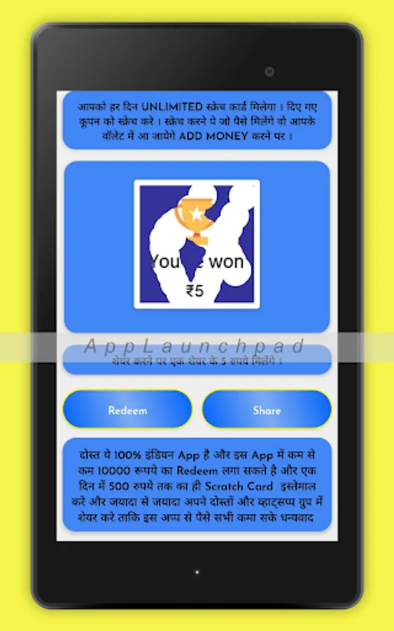 Moreover, Scratch Card To Win Cash, This App does not present themselves as a spying or secret surveillance and does not contains Viruses, Trojan horses, malware, spyware or any other malicious software also is not any related functionality or plugins. so good luck for all app's users.