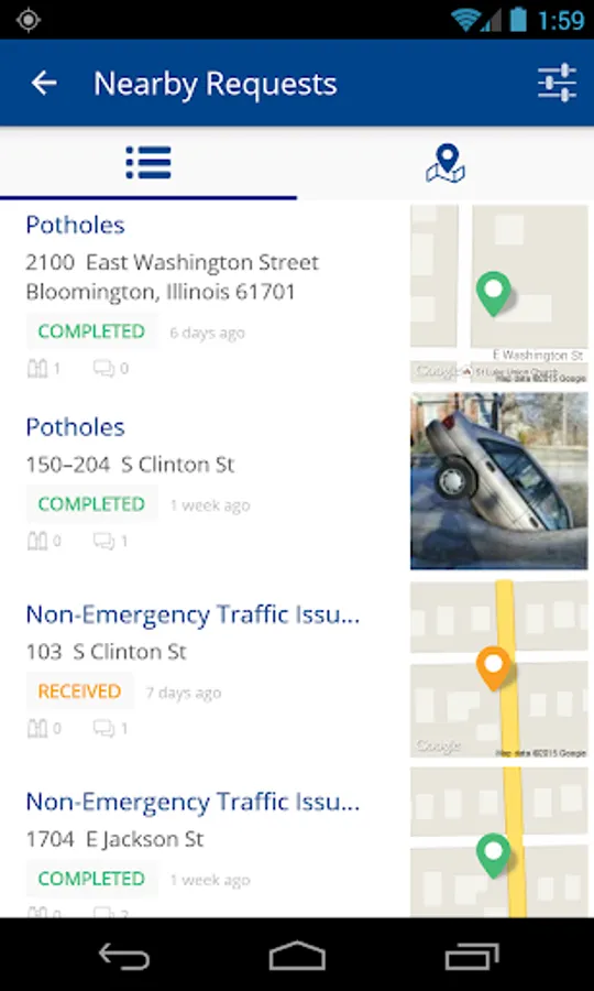 The myBloomington app is your official civic engagement tool to stay in touch with the City of Bloomington. The app allows service requests (potholes, noise complaints, dangerous conditions, etc.) to be submitted directly to City Hall, where it will be instantly routed to the correct city staff in the appropriate department. This means your service requests will be responded to quickly and efficiently, and you'll be notified the instant they are resolved!