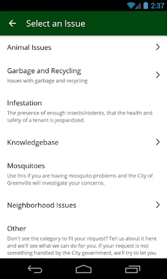 Find yourself in need of some help and need to request a service from Greenville, NC’s City government? Greenville City Compass enables you to submit service requests (report a pothole, graffiti, service problems, etc) from your mobile device directly to the appropriate City personnel. Select a request, add a description and/or a picture, and submit it right from the site of your problem to the City. No need to wait until you get home to send in the information – City Compass uses the GPS information in your phone to let the City know where the problem is. This means your service requests will be responded to quickly, accurately, and efficiently.