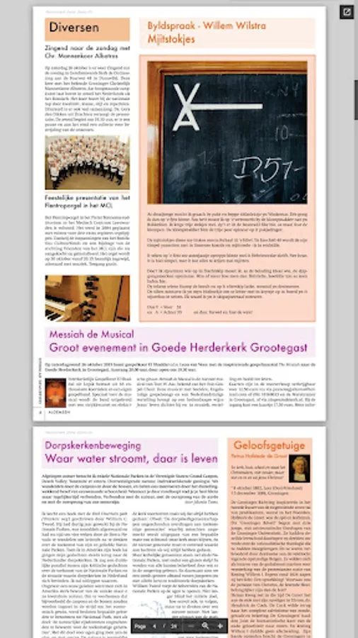 Each issue consists of a general part (6 pages) with news, background and opinions about church and society and a (different per edition) part in which the affiliated municipalities make their announcements about services, pastoral care, administration and activities.