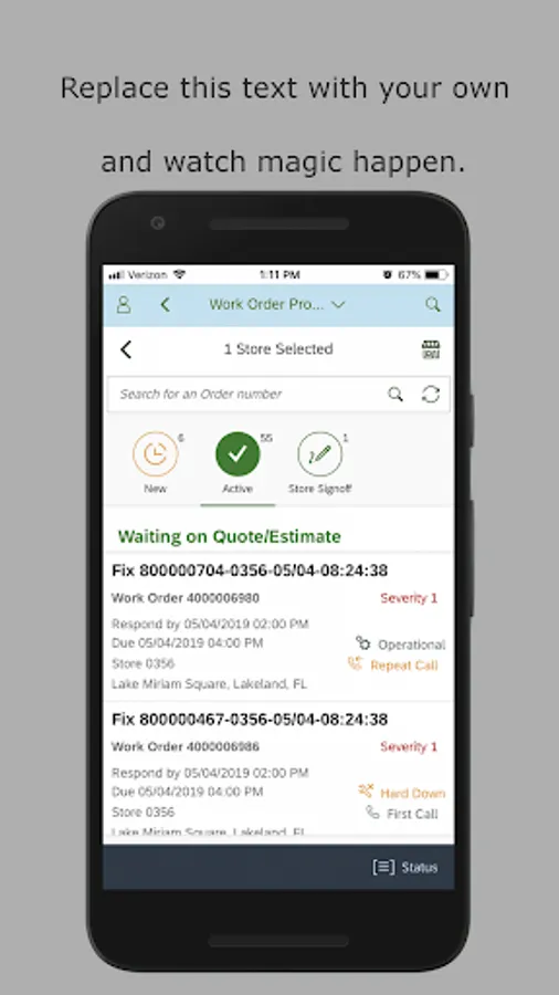 • Move work orders to different stages of completion (Open, Acknowledge, In Progress, Completion, and Sign Off).