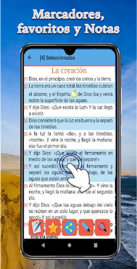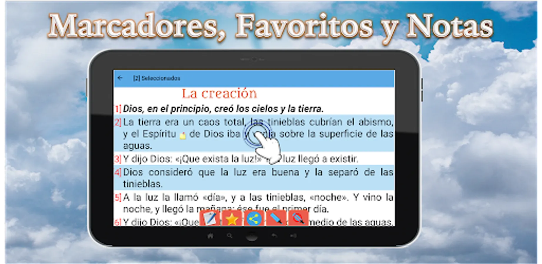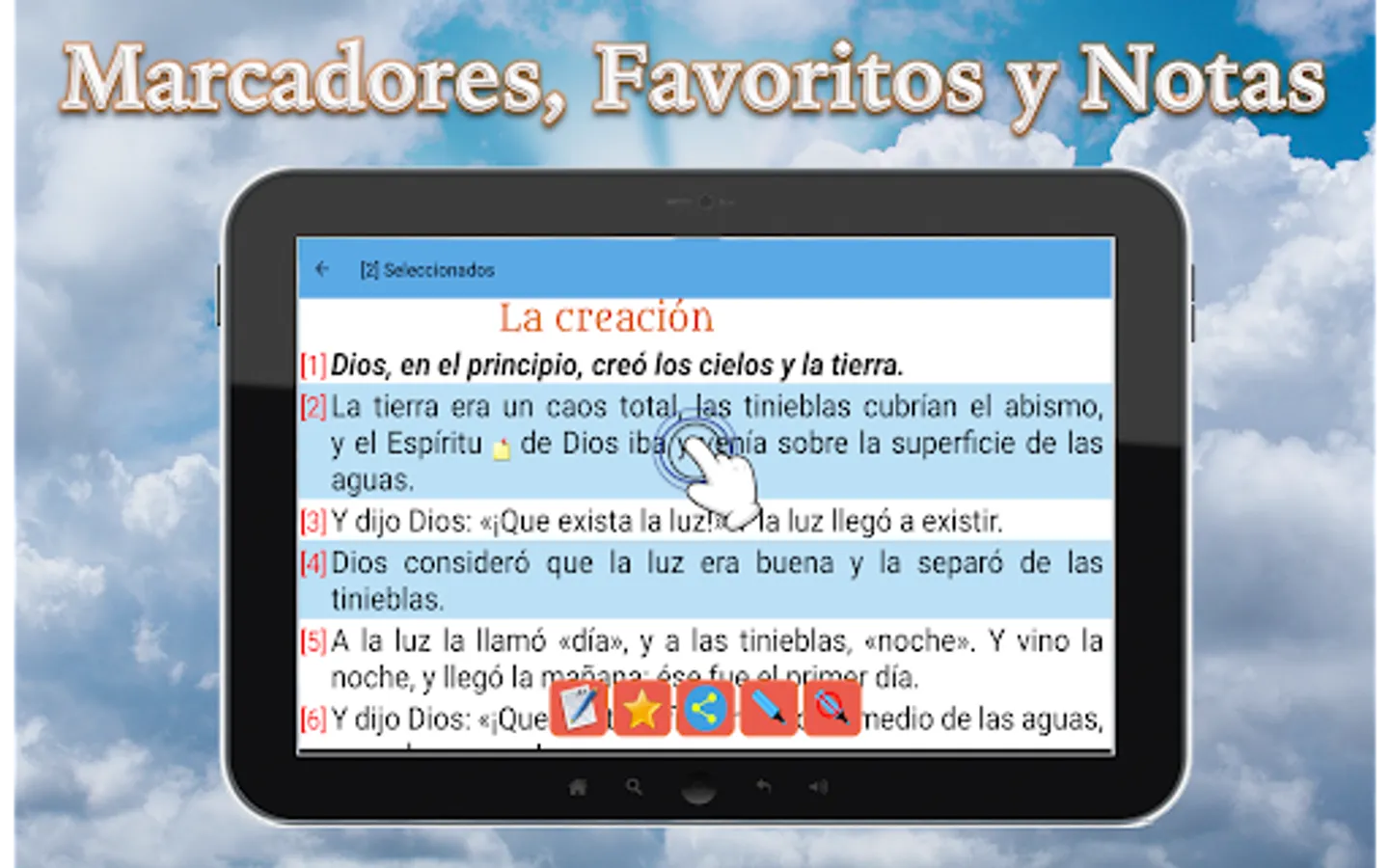 Puede seleccionar uno o varios versículos de un capitulo y marcar como favorito tambien puedes compartir con tus amigos los versículos en las diferentes redes sociales.