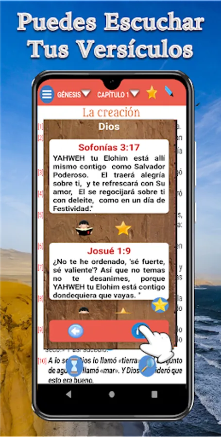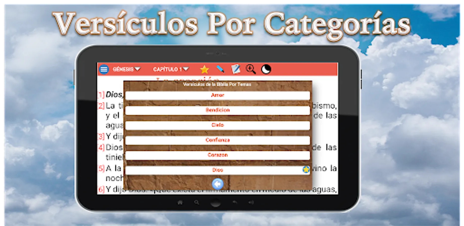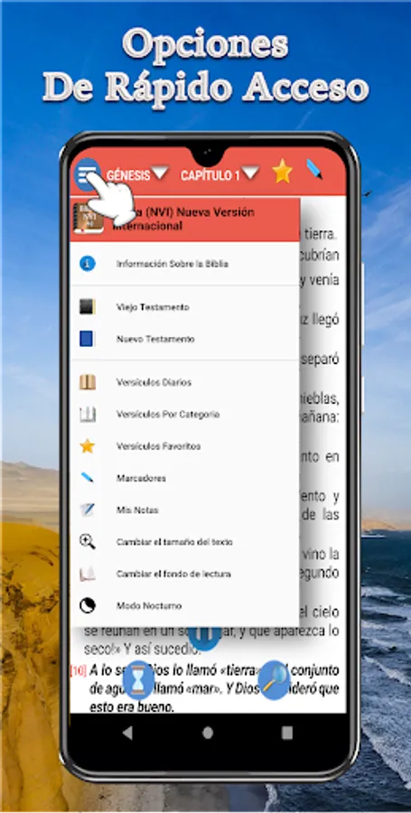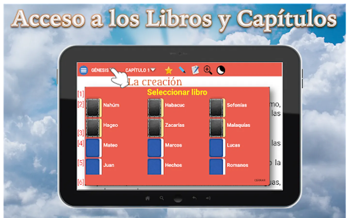 Usted puede hacer clic en la pantalla y la en la parte inferior aparecerá el nombre de libro y el capítulo, al presionarla aparecerá el listado de los libros y en la otra los capítulos que posee el libro seleccionado.