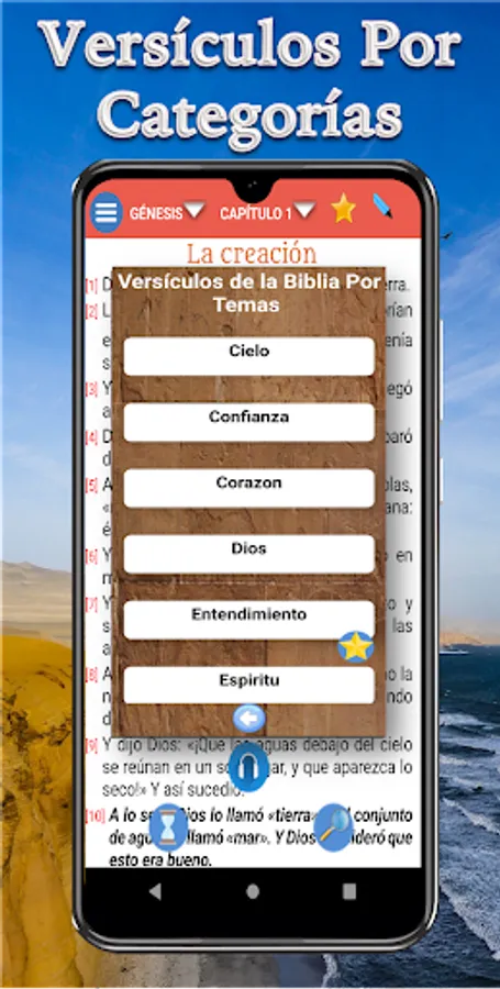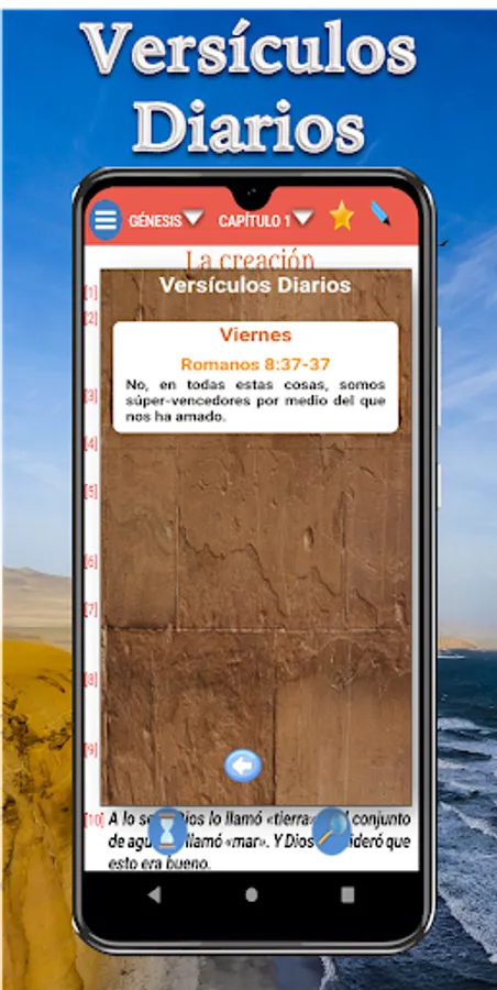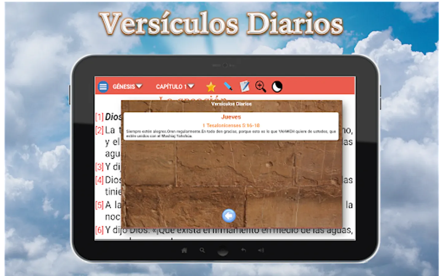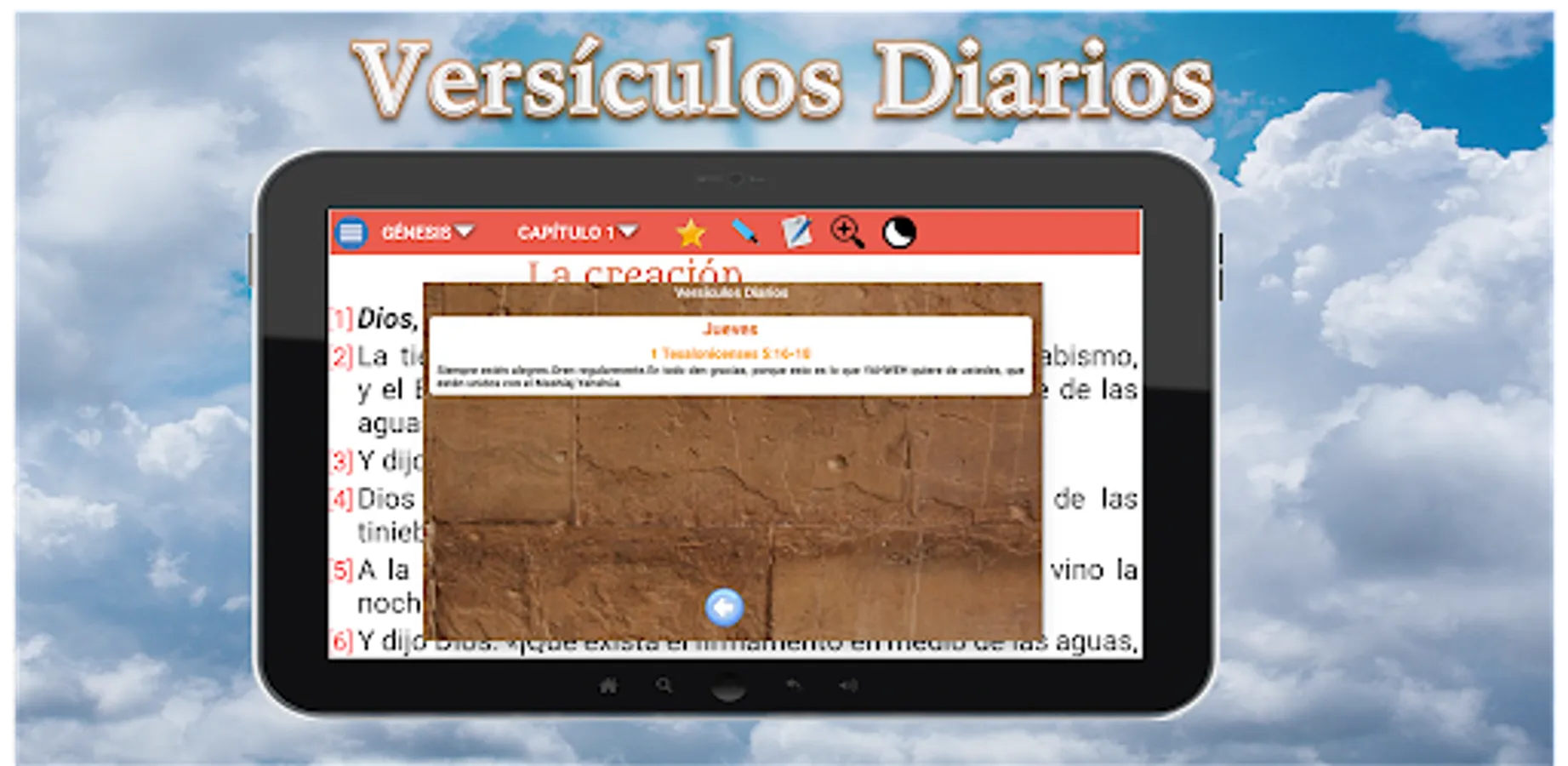 Usted puede hacer clic en la pantalla y la en la parte inferior aparecerá el nombre de libro y el capítulo, al presionarla aparecerá el listado de los libros y en la otra los capítulos que posee el libro seleccionado.