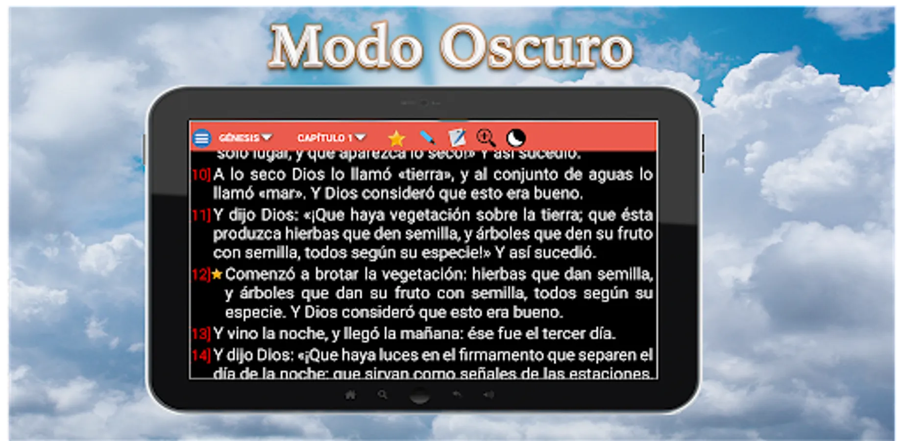Acceso al menú de opciones de forma rápida y sensilla. Opción para cambiar el tamaño del texto. Cambio de fondo de lectura del libro. Acceso a los capítulos y versículos favoritos. Búsqueda de palabras en los libros, capítulos y versículos. Modo nocturno para facilitar la lectura y disminuir la luz de la pantalla.