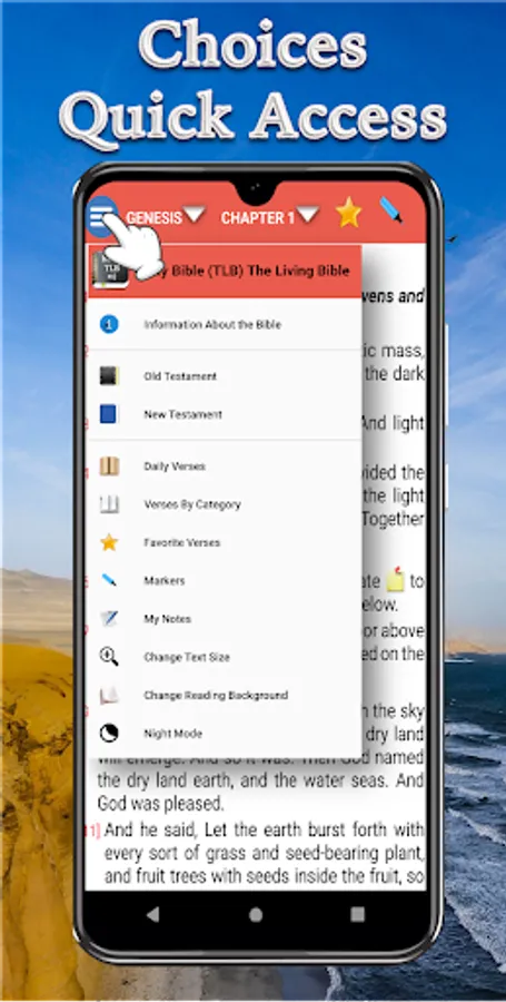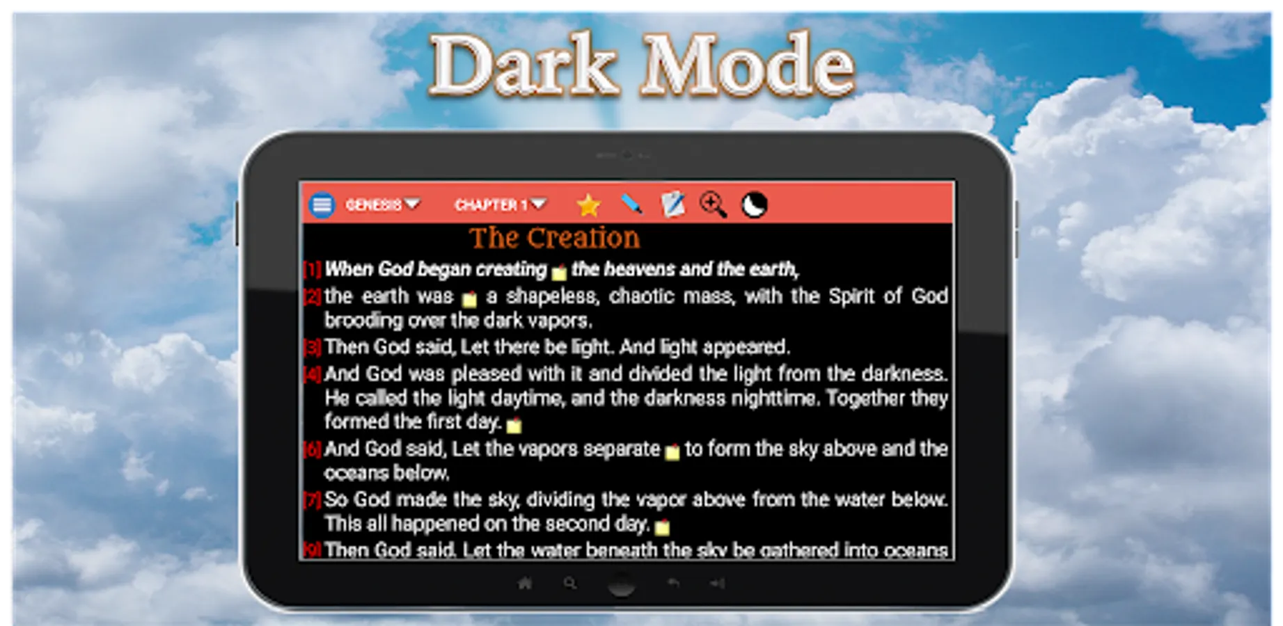 Access to the options menu quickly and sensibly. Option to change the text size. Change of reading background of the book. Access to favorite chapters and verses. Search for words in books, chapters and verses. Night mode to facilitate reading and decrease the light of the screen.